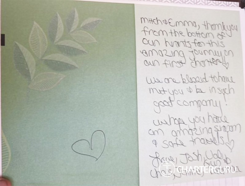 We are so thankful we have met you! You are both amazing and beautiful! Thank you again for your kindness hospitality and patience our first Charter has been wonderful, and we greatly appreciate your expertise guidance and assistance during this incredible week that we have had! We will miss you and will be thinking of you! We hope the next of your guests this Charter season have a lot less luggage!
