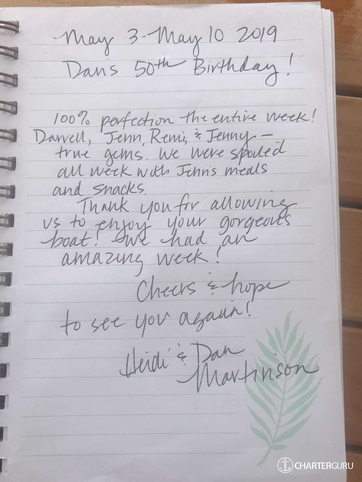 100% perfection the entire week! Darrel, Jenn, Remi and Jenny - true gems. We were spoiled all week with Jenn's meals and snacks. Thank you for allowing us to enjoy your gorgeous boat! We had an AMAZING week! Cheers and hope to see you again! Heidi and Dan