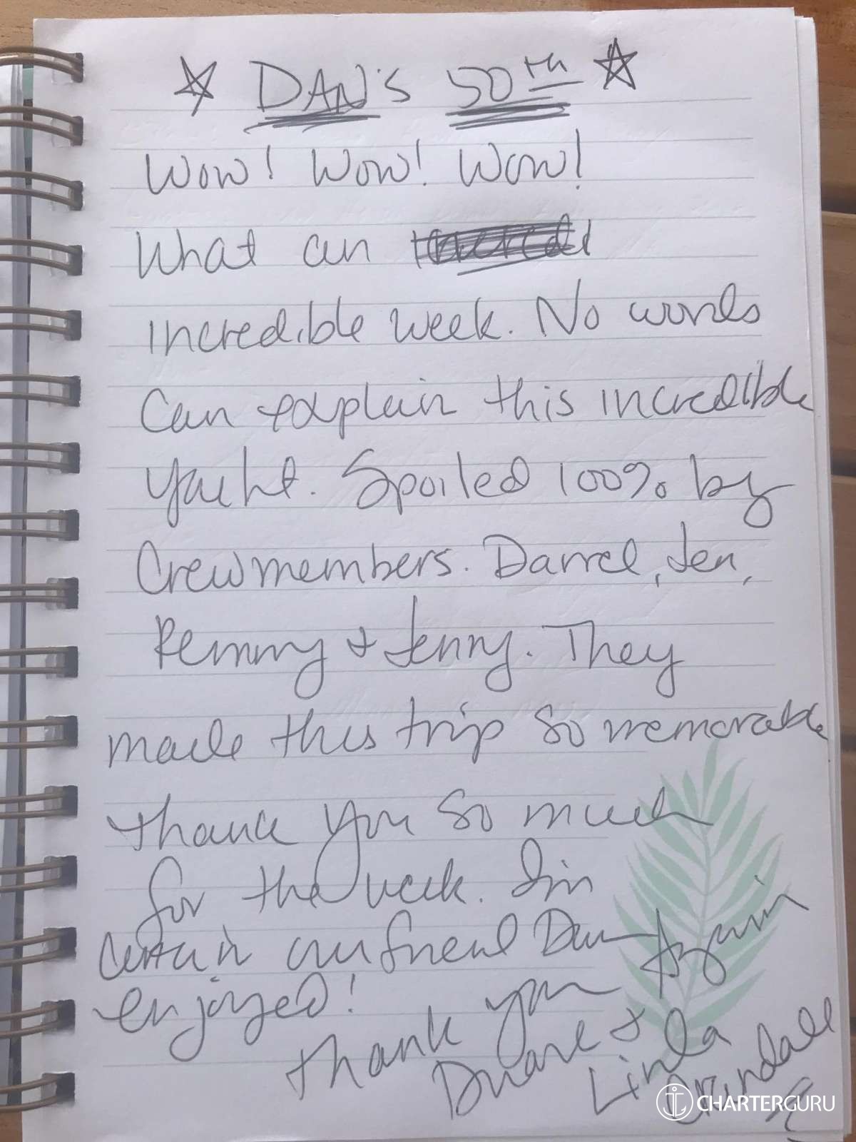 Wow! Wow! Wow! What an incredible week! No words can explain this incredible yacht. Spoiled 100% by crew members, Darrel, Jen, Remmy and Jenny. They made this trip so memorable. Thank you so much for the week I'm certain our fried Dan enjoyed! Thank you again, Diane and Linda