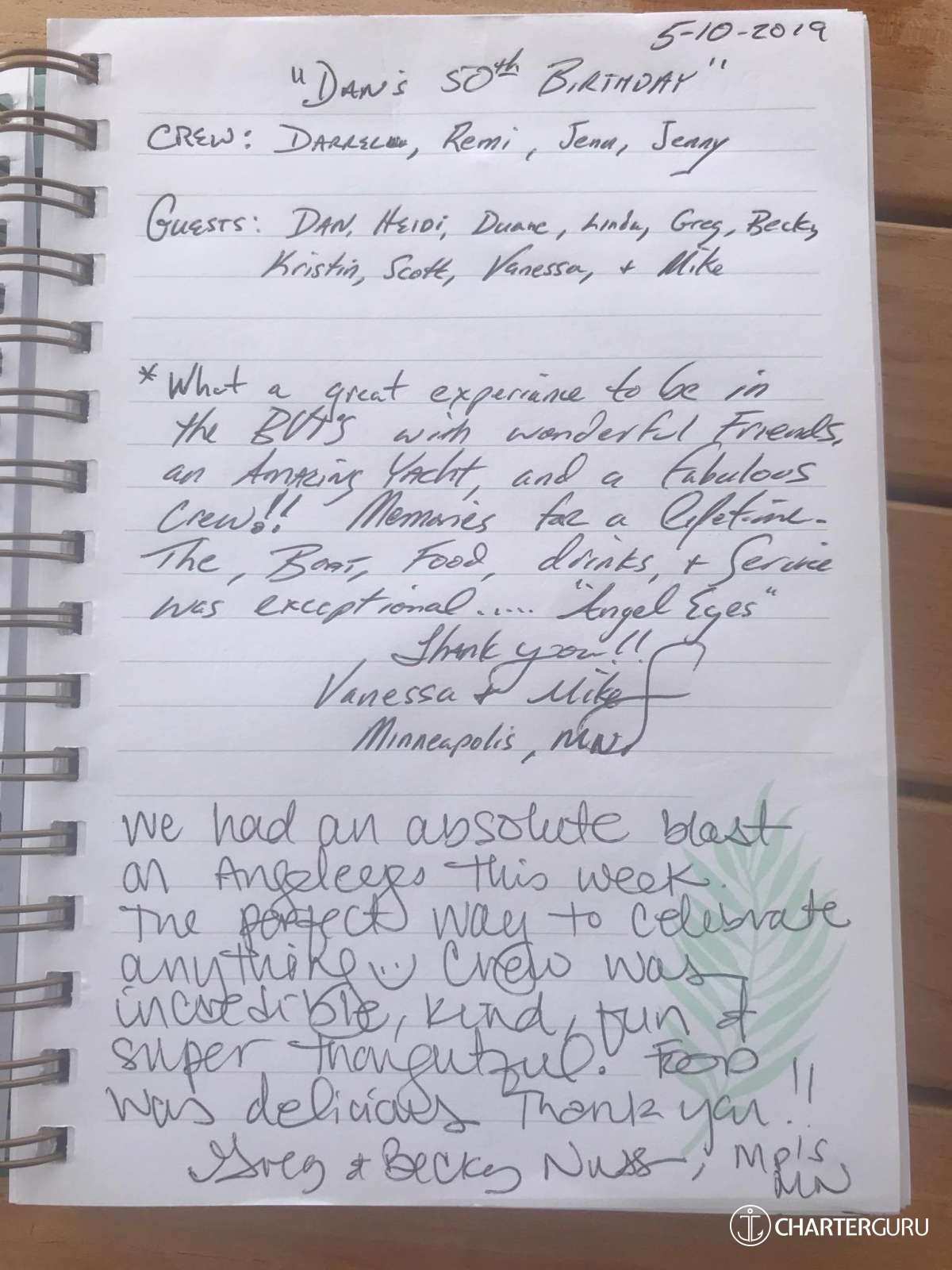 Angeleyes crew - Thank you for such a memorable romantic getaway! We felt SO taken care of by the extraordinary crew - all teh delicious meals, sublime drinks, beautiful anchorages, made for a a really special trip. What a great boat and even better crew! We hope to be back with the whole family in the future! - Caitlyn and Gavin