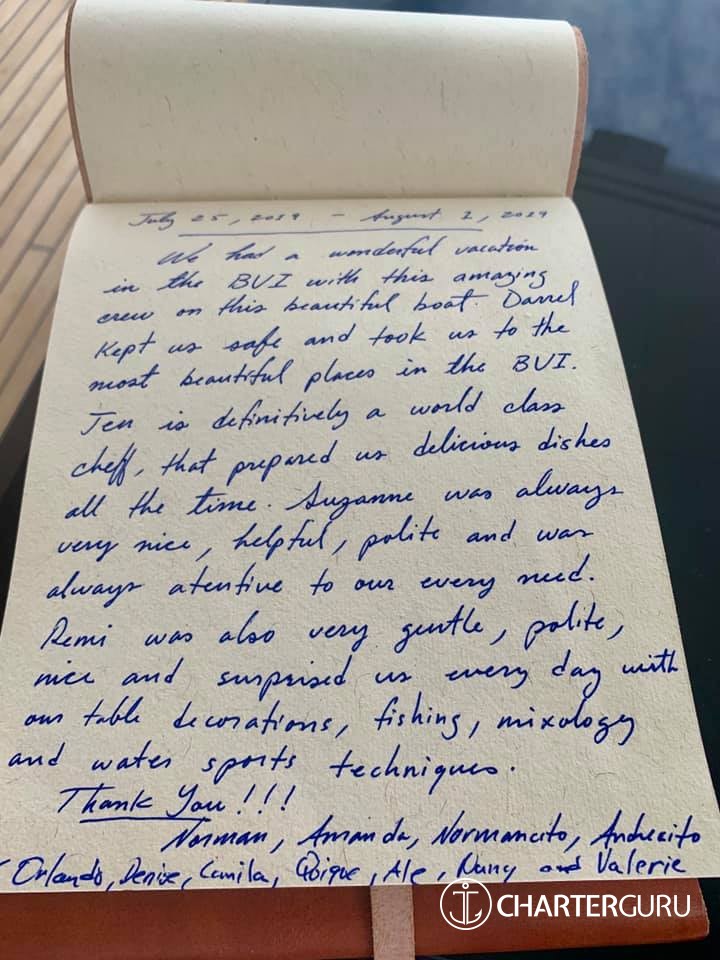 We had a wonderful vacation in the BVI with this amazing crew on this beautiful boat. Darrel kept us safe and took us to the most beautiful places in the BVI. Jen is definitely a world class chef, that prepared us delicious dishes all the time. Suzanna was always very helpful, polite and was always attentive to our every need. Remi was also very gentle, polite, nice and surprised us every day with our table decorations, fishing, mixology and water sports techniques. Thank You!!!