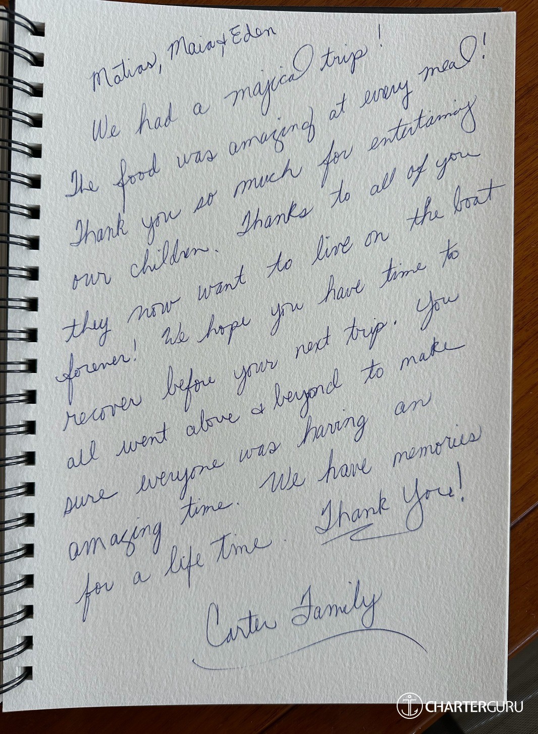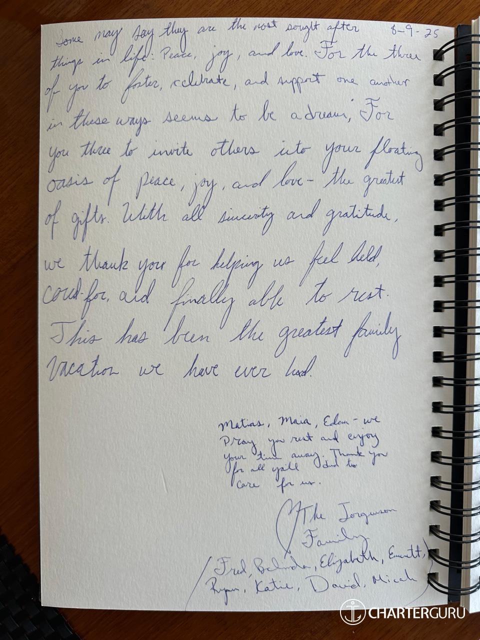 Thank you so much for helping us have the most amazing vacation that we will never forget. From Matias' knowledge to Maia's beautiful personality and talent, and our favorite chef Eden, with his amazing culinary skills!! Miguel and I loved our daily talks with you. May our paths cross again!
