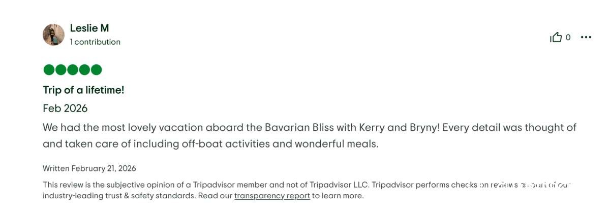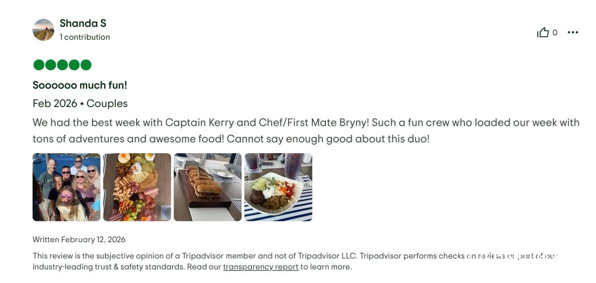 I highly recommend the Bavarian Bliss and the duo of Captain Kerry and Chef Bryny for any future sailing trips.