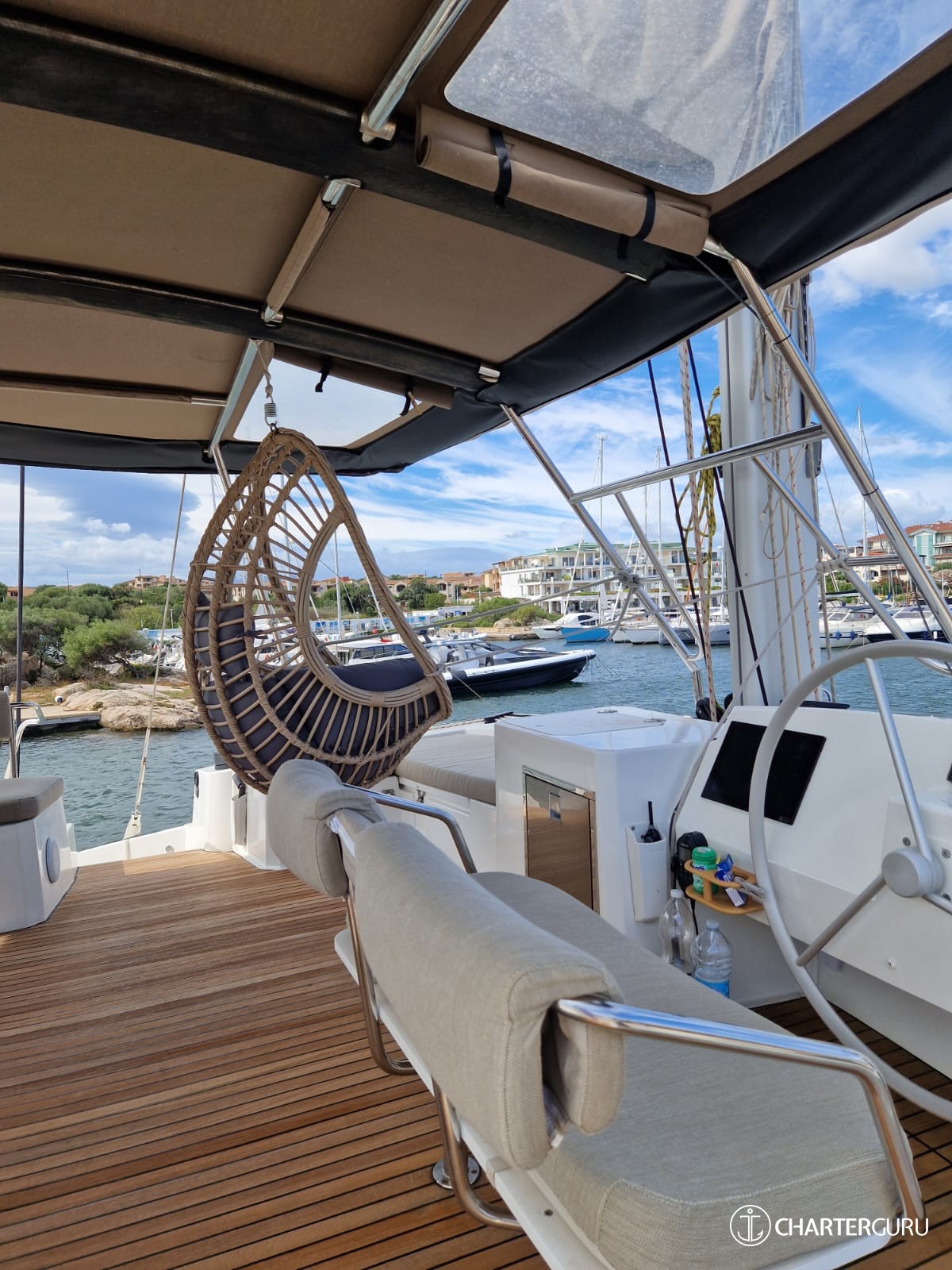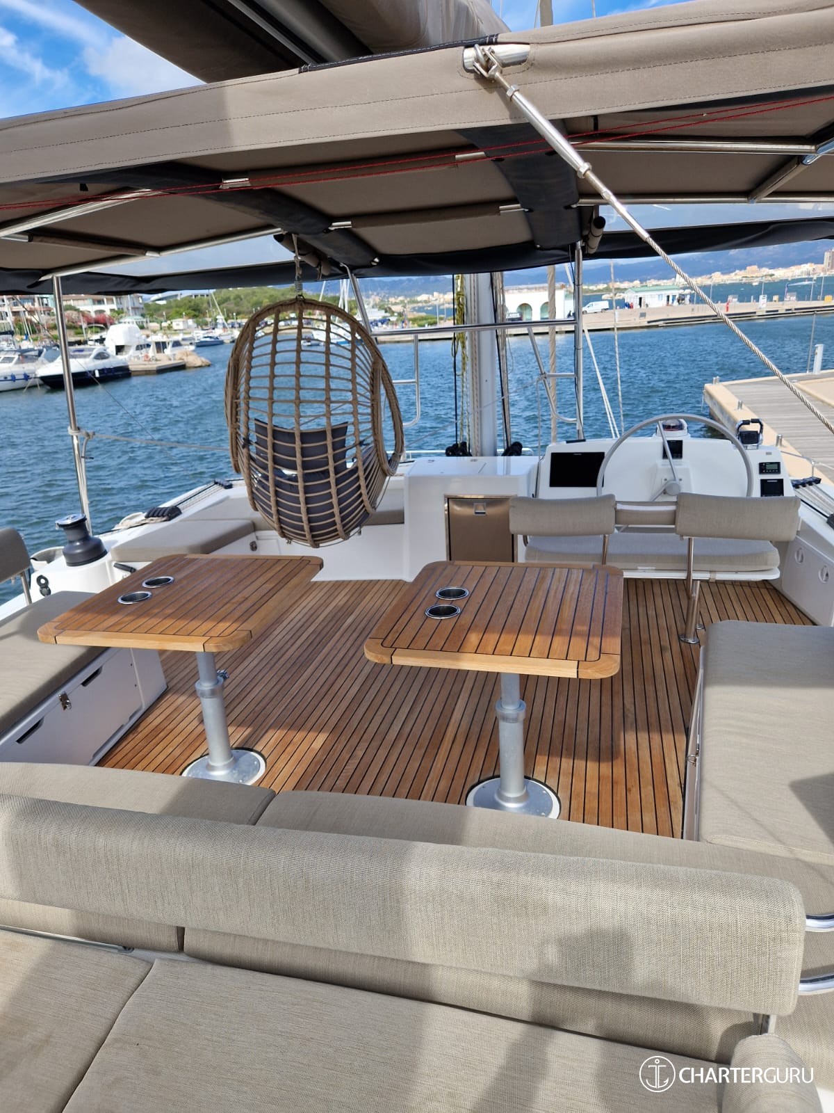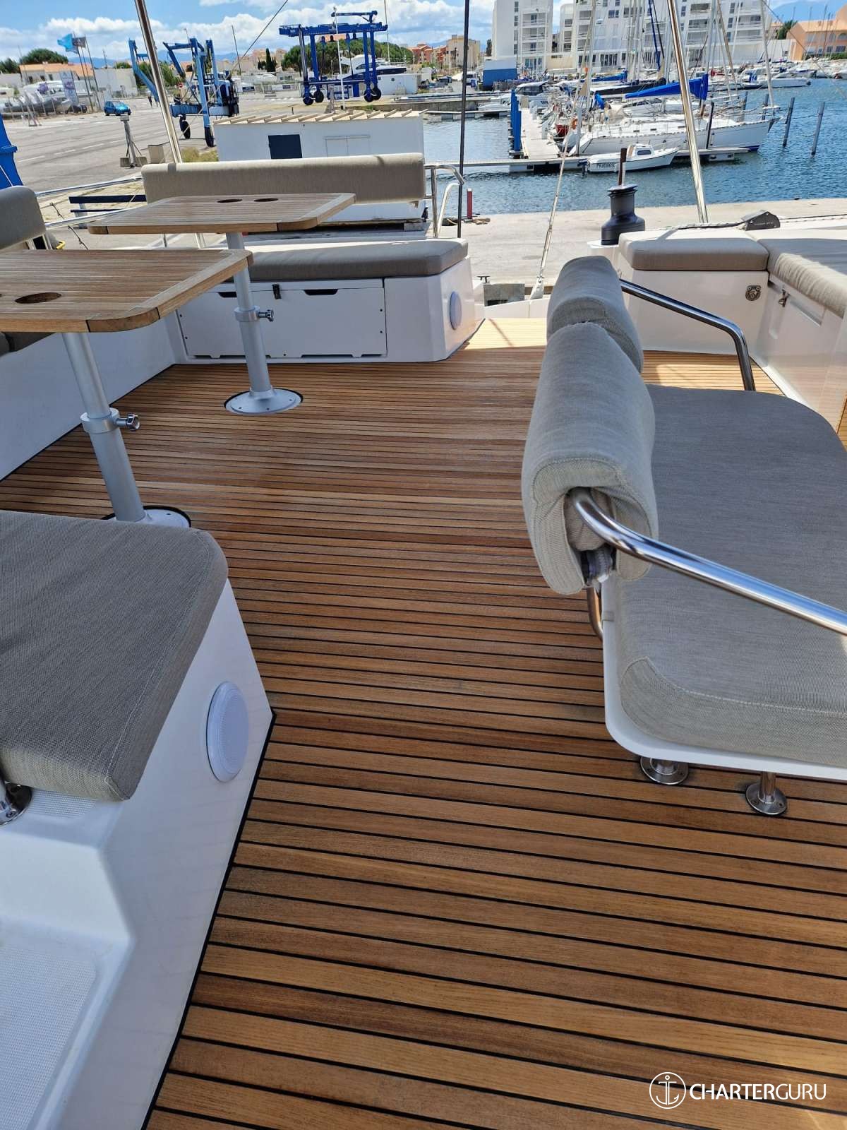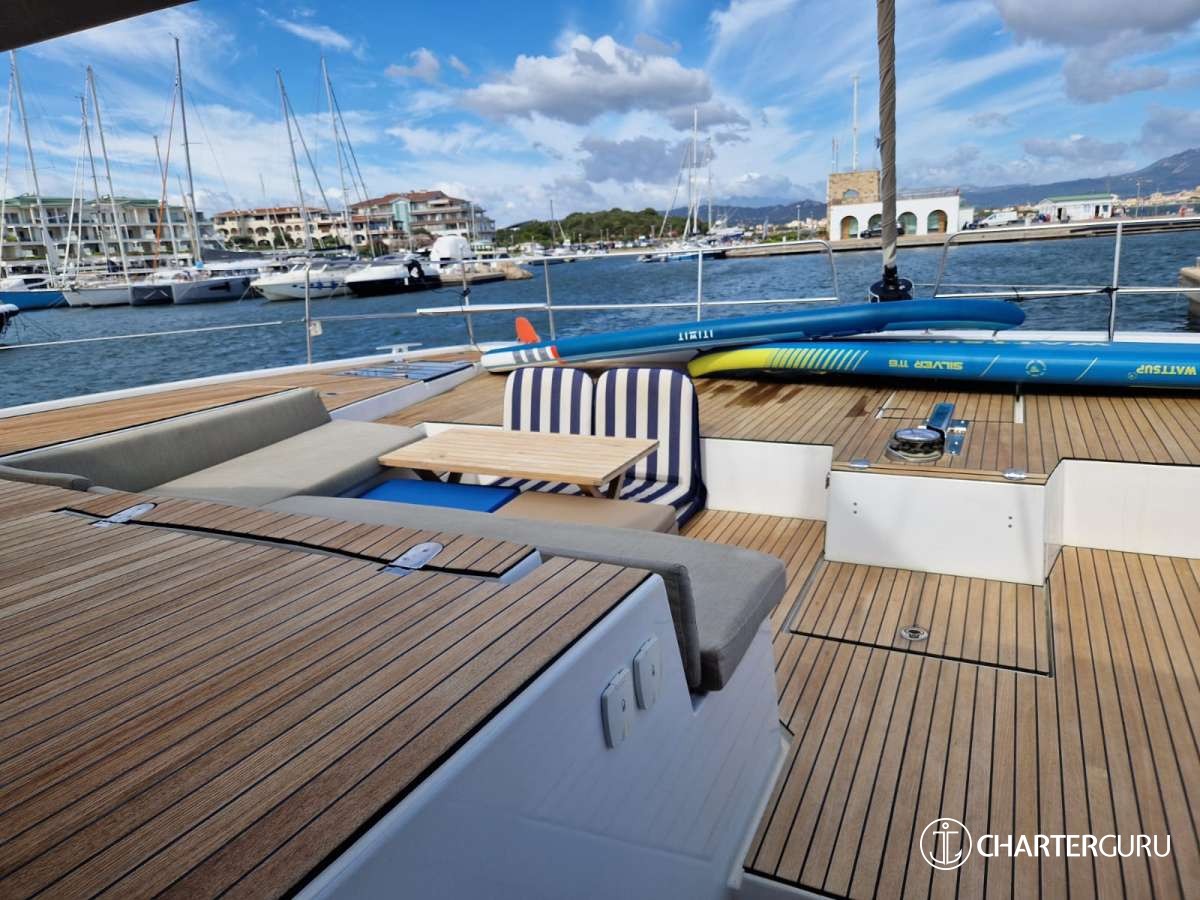 Fully rigid teak bow cockpit with full rigidity. Sunbathing mattresses
