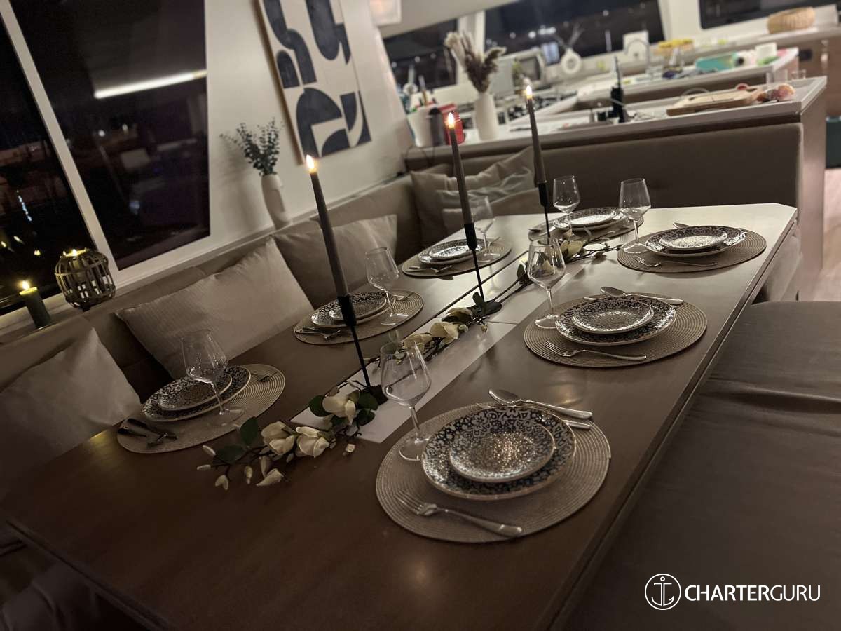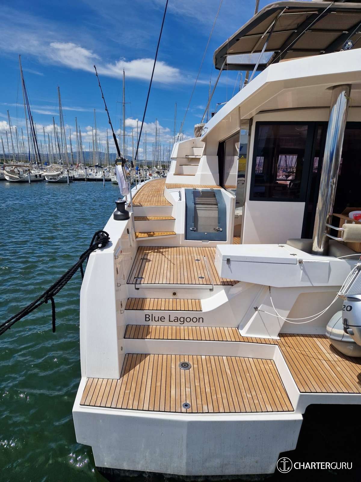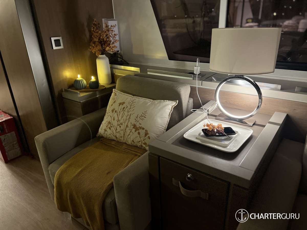 BLUE LAGOON is introduced primarily as a sailing catamaran. The yacht layout radiates from the main saloon, which connects to the aft deck. The aft deck is where heart of the yacht is and usually it is where you, as a charter guest, spend most of your time. The immersive cabins are connected by stairs to the main saloon - roomy, comfortable and pleasant. The cabins are located in the 2 massive hulls. Multiple portholes connect you with the outside world.