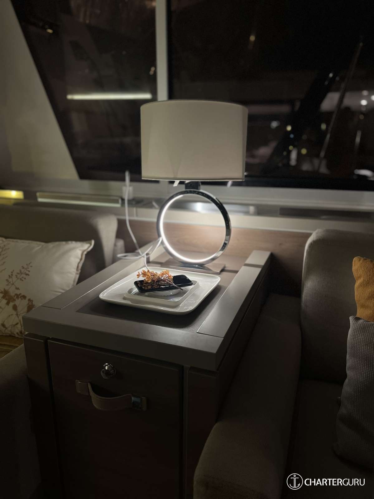 Door for to direct access to bou cockpit. Stain-resistant fabric sofa.