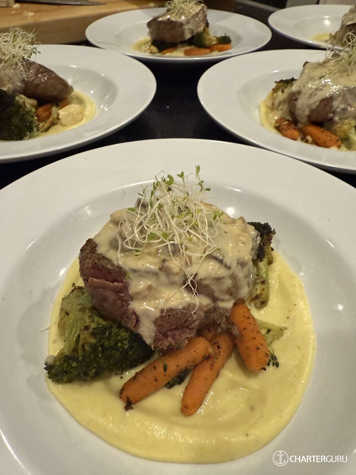 The yen to Captain Paul's yang would be Chef Tyler. Tyler is highly affable, laid back but engaging, and an excellent chef who fed us remarkably well. Breakfast included lobster frittata, a pair of breakfast pastries (one sweet one savory), a spinach omelet with side of bacon; each breakfast was served with a platter of lovely, local fresh fruit and French pressed coffee. Lunches were generally on the lighter side as requested and included a lovely seared tuna over quinoa salad with ginger dressing, a fabulous pan fried swordfish taco, a flank steak over mixed greens salad, amongst others all delicious. There was generally an appetizer served during cocktail hour and/ or sunset sail again all very successful: delicious small sausage stuffed peppers, cheese and charcuterie board, spinach and artichoke pastries, Kobei beef sliders with deviled eggs (amazing!), and on each occasion either Tyler or Captain Paul would bring a well crafted cocktail or lovely glass of wine with a smile. Dinners were also excellent fare: pan seared scallops over squid ink pasta, perfectly cooked lamb lollipops over butternut squash puree, a lovely salmon with roasted potatoes. All meals were accompanied by nice wines (white burgundies, albarinos, malbecs, etc) and followed by a nice dessert.