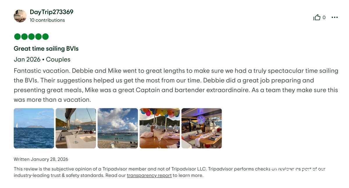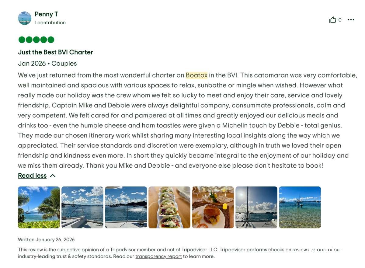 From the moment we stepped on board, they made us feel completely at home. Their warmth and genuine care set the tone for the entire trip. Mike's calm, capable presence as captain gave us total confidence as we island-hopped through some of the most beautiful waters in the world, and he always found the perfect places-whether we wanted a lively spot near beach bars or a quiet, postcard-worthy cove.