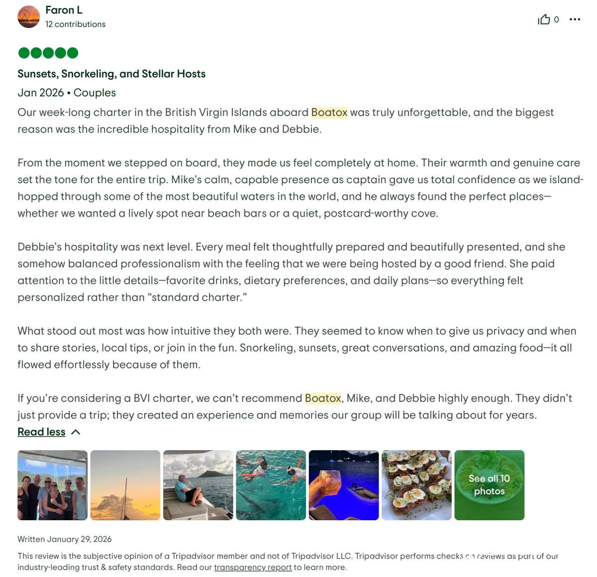 If you're considering a BVI charter, we can't recommend Boatox, Mike, and Debbie highly enough. They didn't just provide a trip; they created an experience and memories our group will be talking about for years.