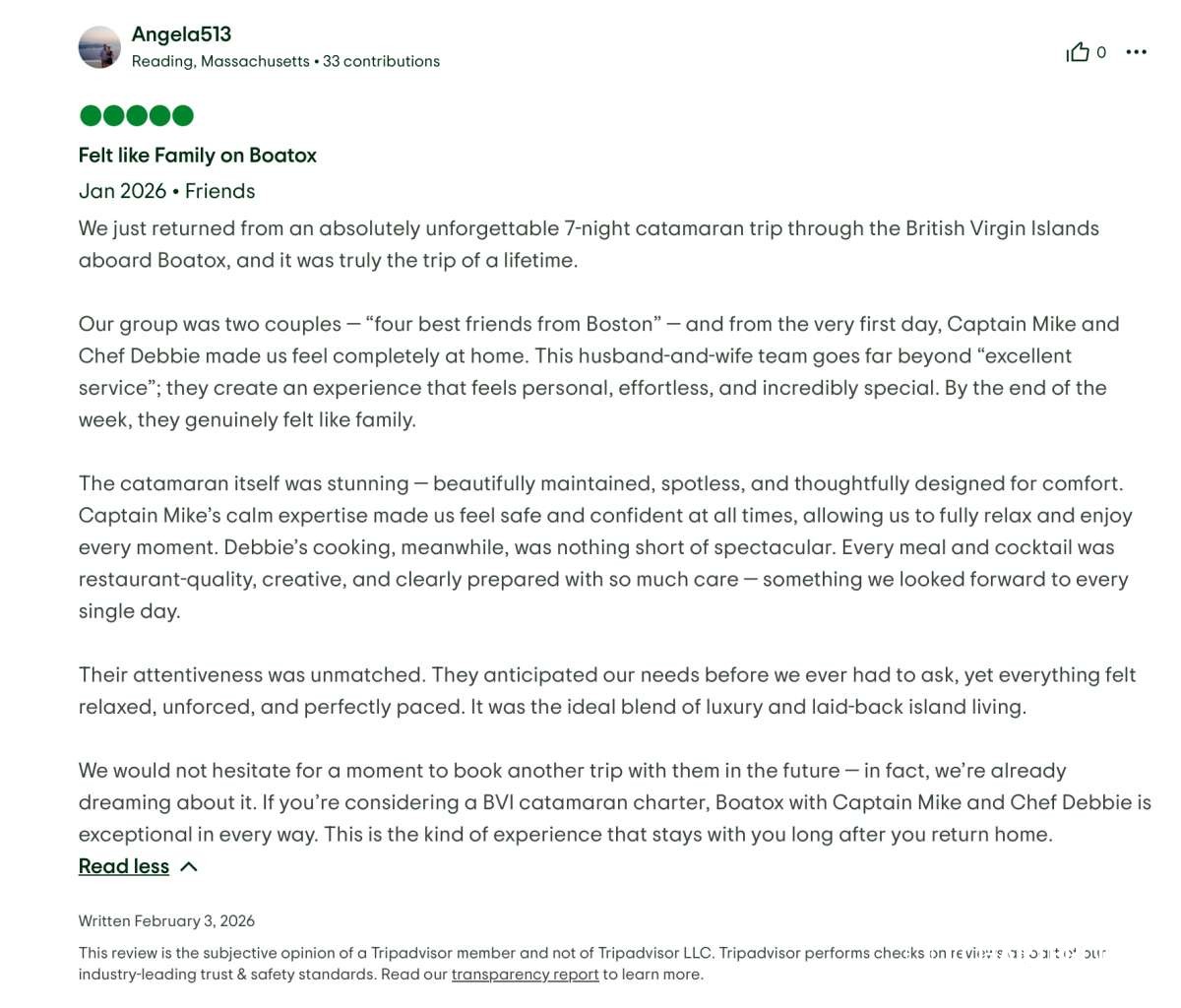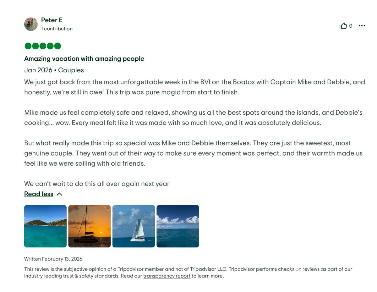 We would not hesitate for a moment to book another trip with them in the future — in fact, we’re already dreaming about it. If you’re considering a BVI catamaran charter, Boatox with Captain Mike and Chef Debbie is exceptional in every way. This is the kind of experience that stays with you long after you return home.