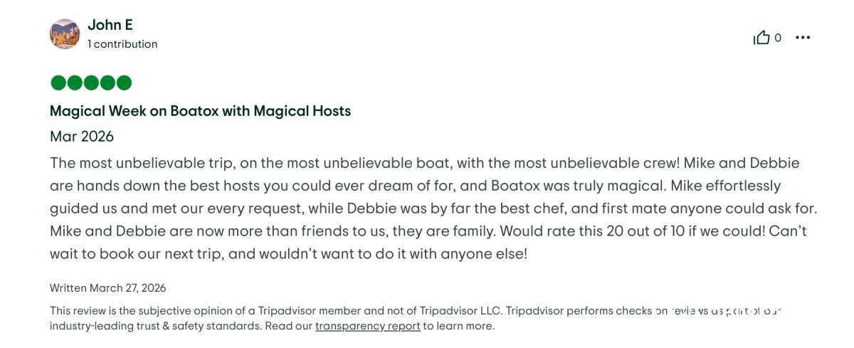 I truly can't say enough about our week on BOATOX. Between the incredible boat, the outstanding crew, and the beauty of the islands, this was easily one of the most memorable trips of my life. Mike and Deb-thank you for creating such an unforgettable week for all of us.