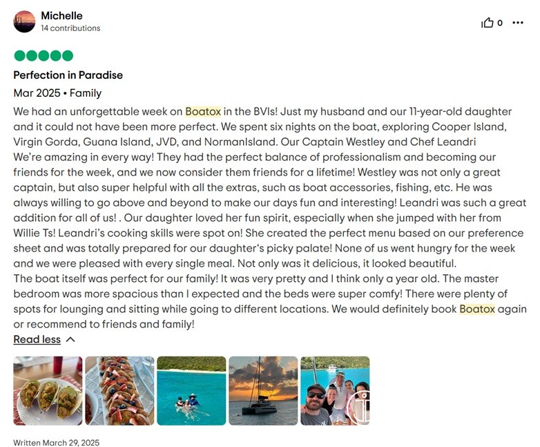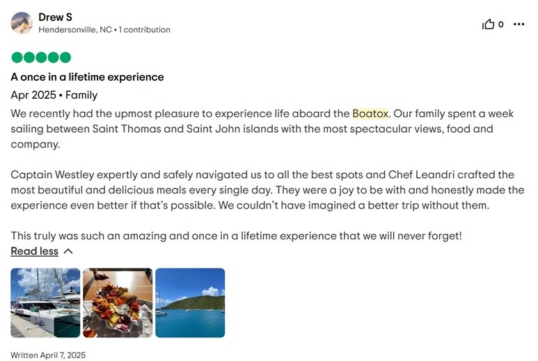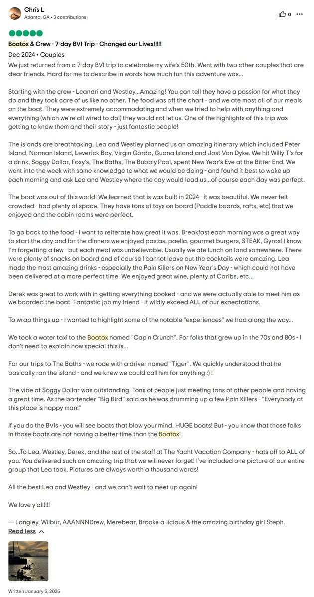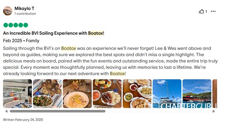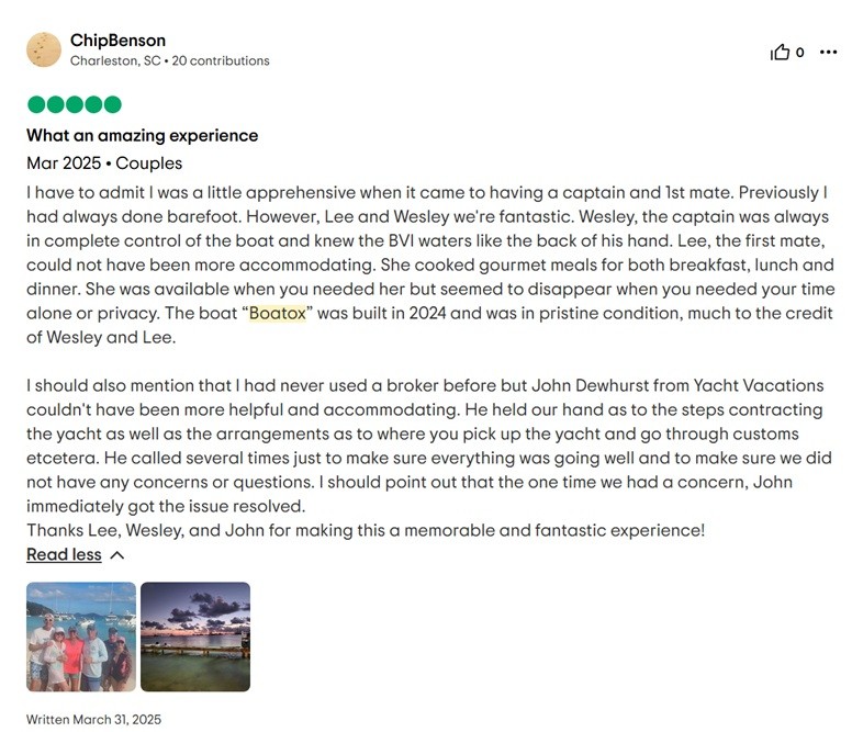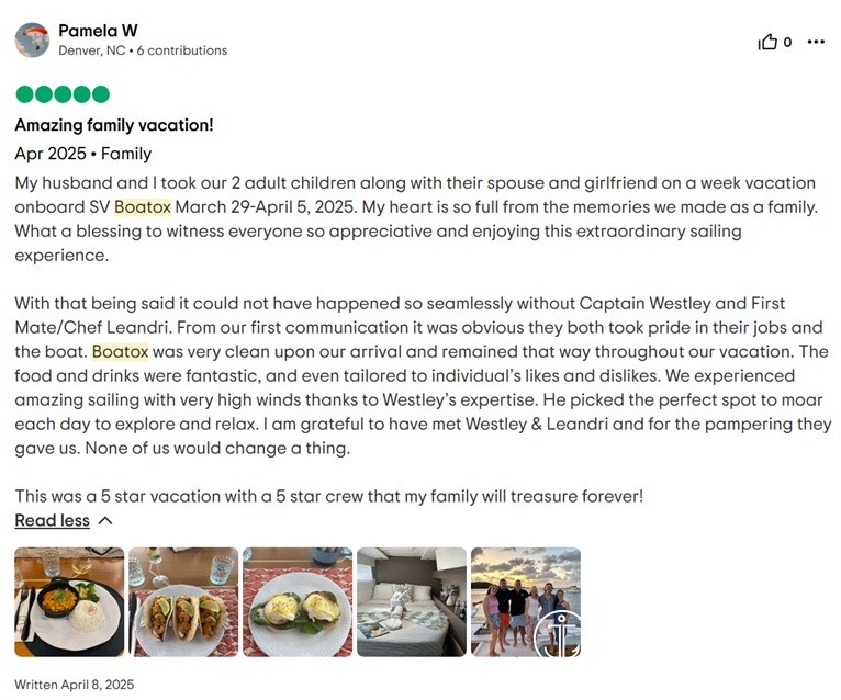 With that being said it could not have happened so seamlessly without Captain Westley and First Mate/Chef Leandri. From our first communication it was obvious they both took pride in their jobs and the boat. Boatox was very clean upon our arrival and remained that way throughout our vacation. The food and drinks were fantastic, and even tailored to individual’s likes and dislikes. We experienced amazing sailing with very high winds thanks to Westley’s expertise. He picked the perfect spot to moar each day to explore and relax. I am grateful to have met Westley & Leandri and for the pampering they gave us. None of us would change a thing.