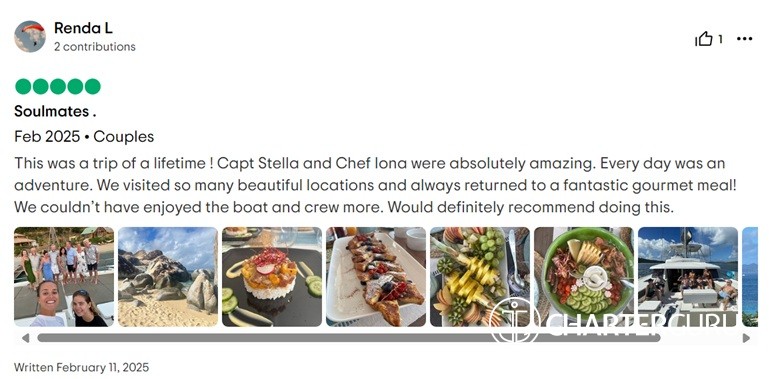 Our Chef, Iona, cooked fresh, delicious meals for breakfast, lunch, and dinner. We had a fun cocktail and appetizers everyday as well. She tailored the meals for what we requested. Both Stella and Iona made this trip an amazing for our group and we would book them again!