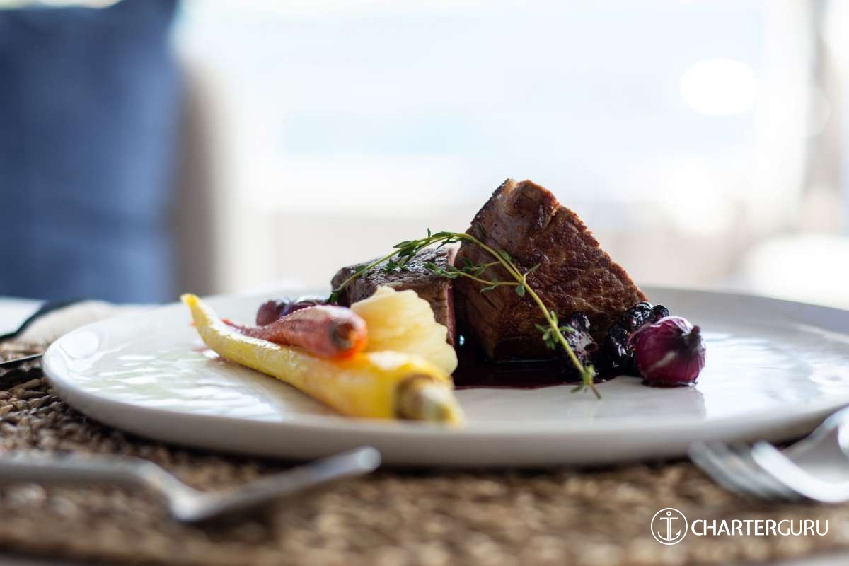 LOCAL FARE: Includes 7 breakfasts, 5 lunches & 5 dinners. Requires 2 lunches and 2 dinners ashore at the clients' expense. For local fare, deduct $150 per person off the charter rate.
