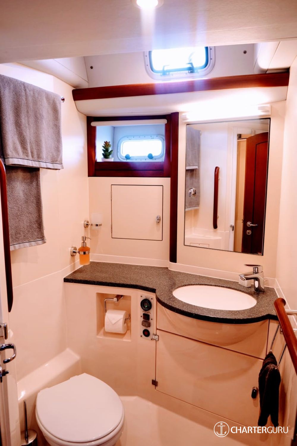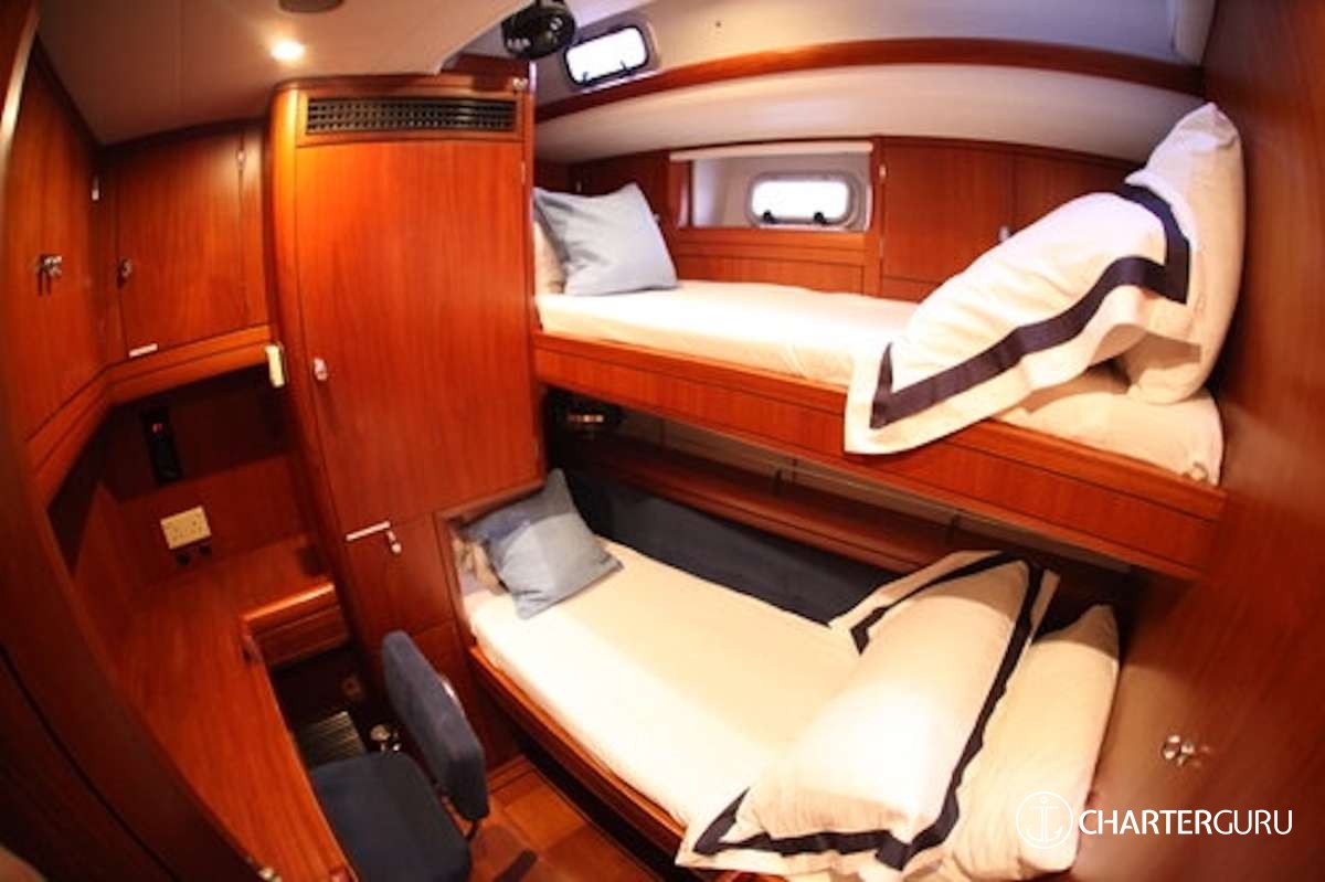 The mid-cabin on the port side has single beds in over/under bunk configuration. The mid-port cabin has an en-suite layout which is also accessible from the main corridor, so it can be used by guests as a day head. This cabin has a skylight hatch and multiple portholes with screen and blind covers, for ventilation by the cool sea breeze.