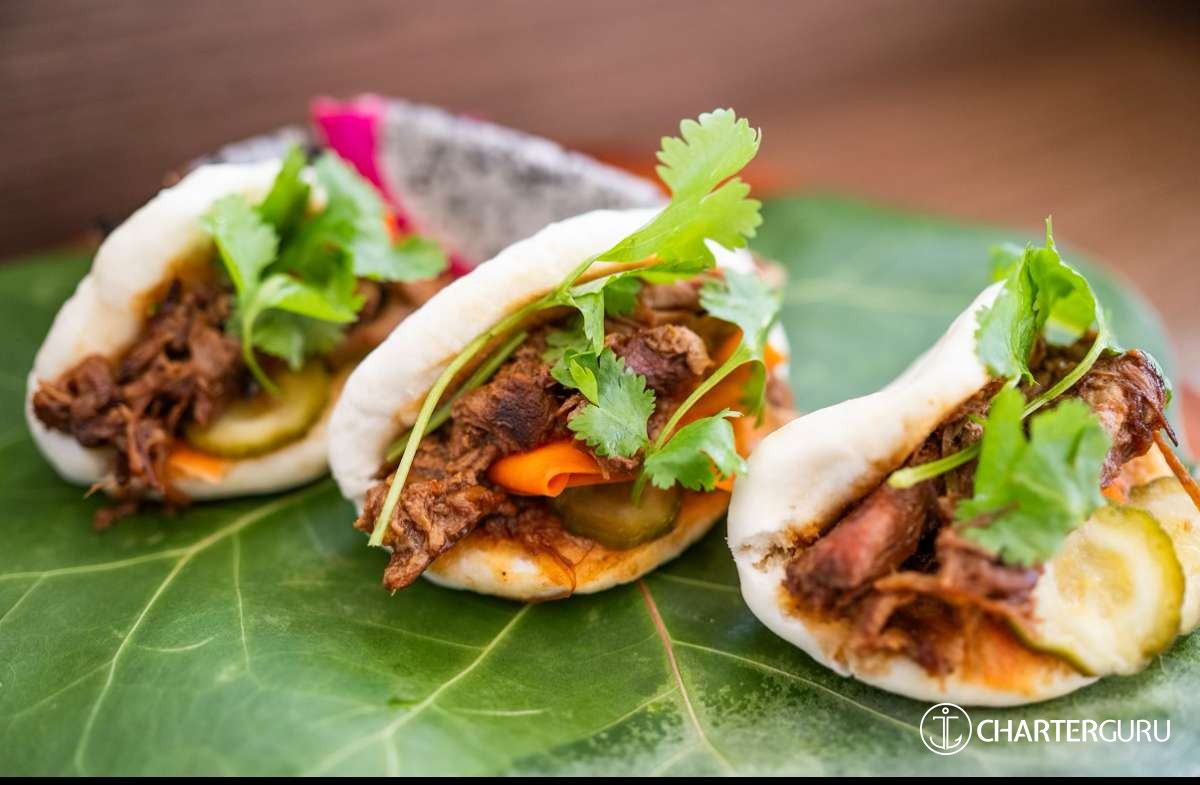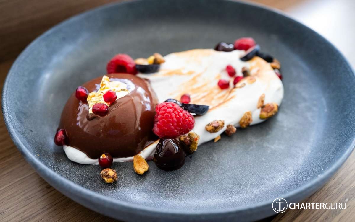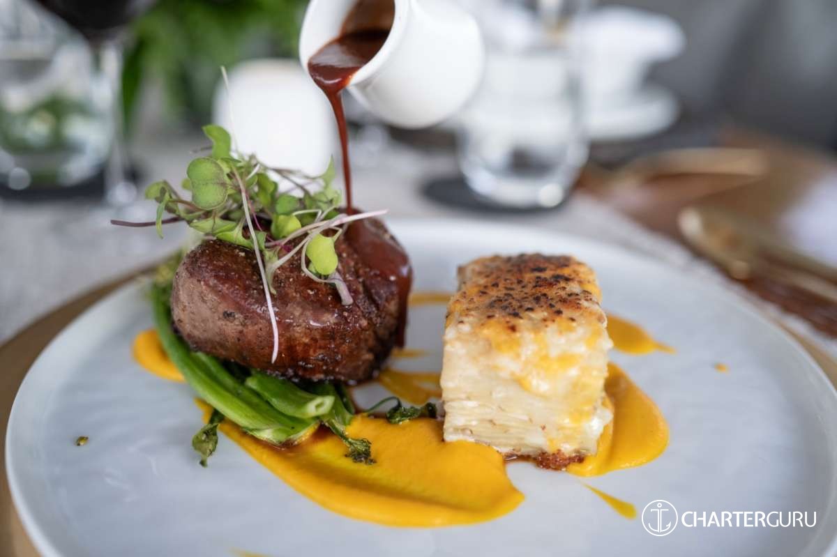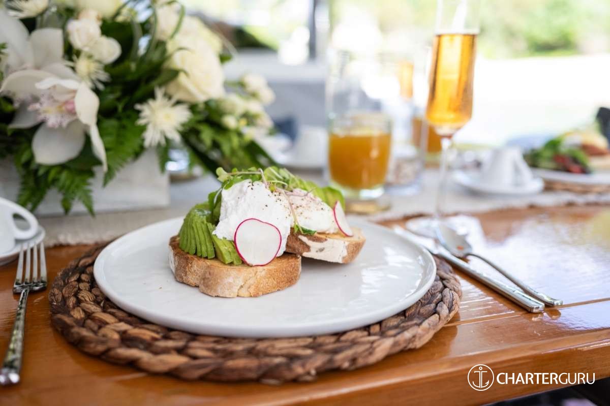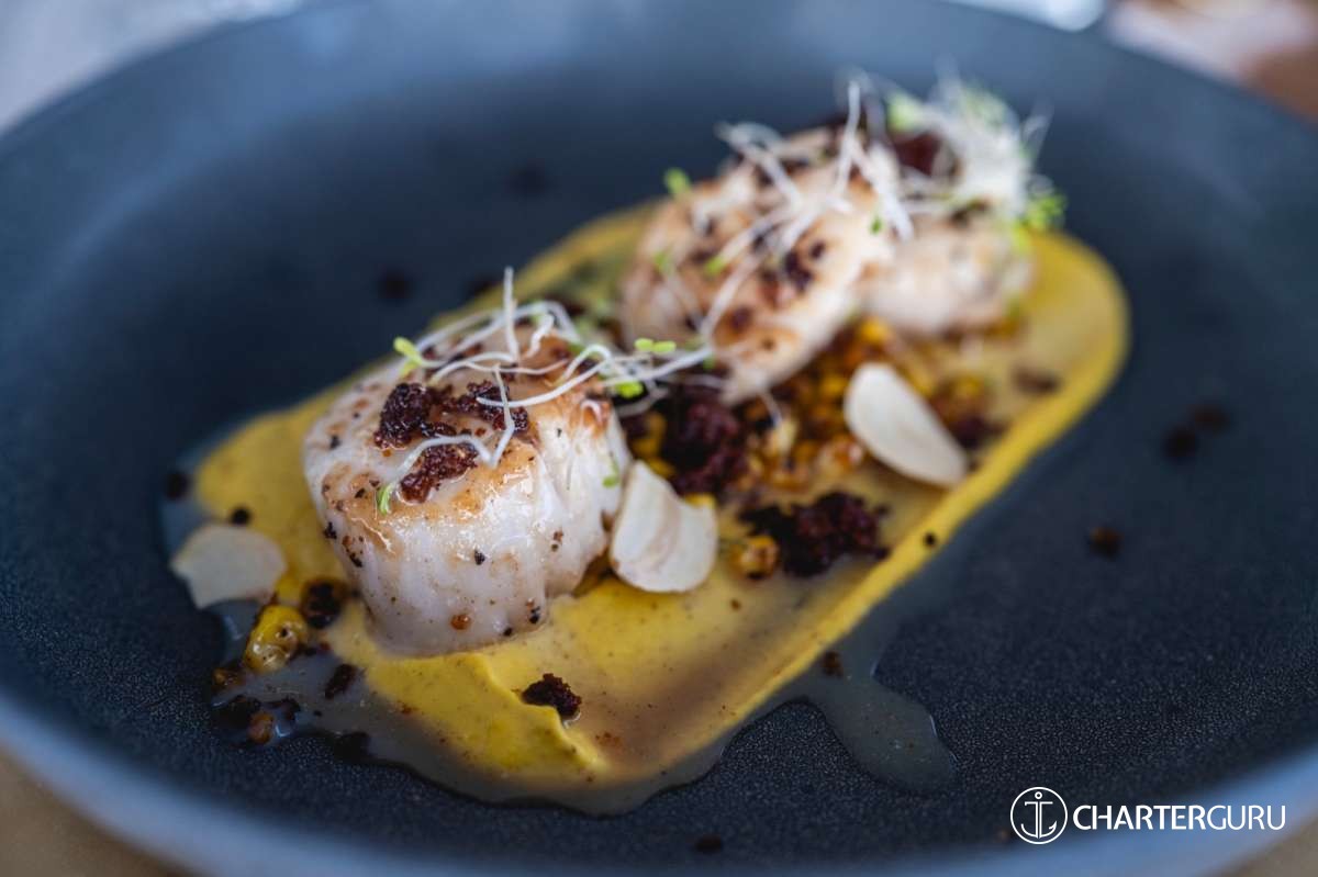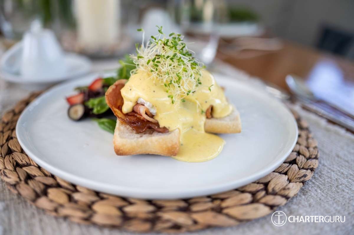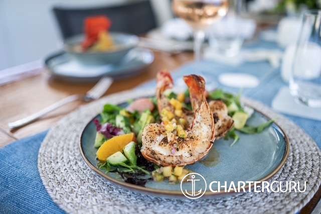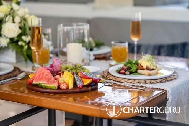 Half Board Option: Includes 7 breakfasts, 4 lunches & 3 dinners. Requires 3 lunches & 4 dinners ashore at client expense. Deduct $150/per person from the all-inclusive charter rate for half board. The entire yacht must choose either half board or full board.