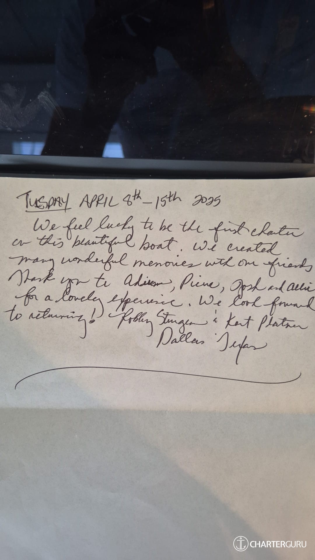 Thank you so much for an incredible week. We all enjoyed Christina and Adrien so much. Perfect itinerary, great meals, wonderful service and a beautiful boat. We are leaving with so many great memories. Thank you for everything. Dave and Tory