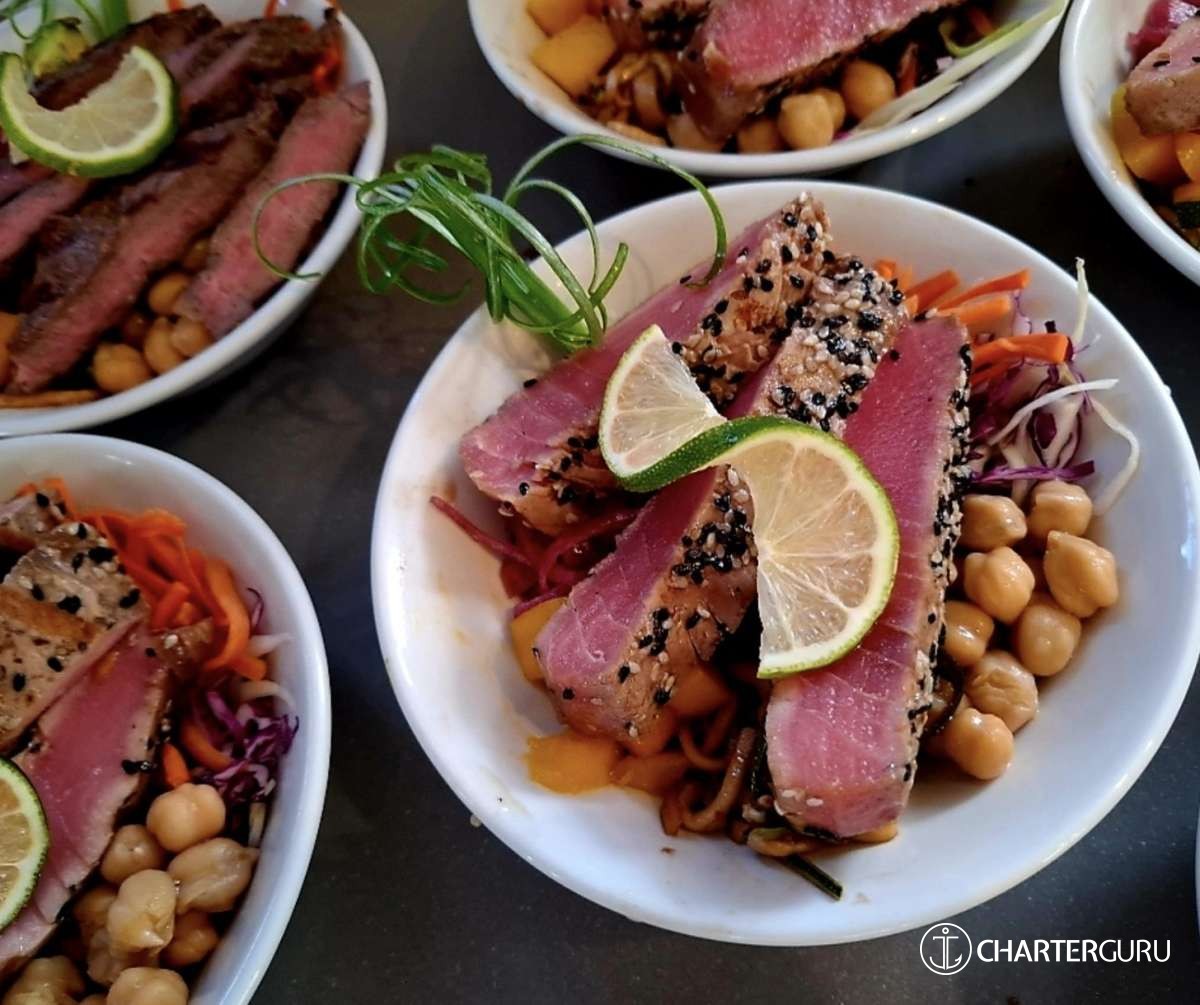 The food was yet another experience. Coffee available as we awoke, the chef made 3 special meals a day for us, each better than the last in some way. Fruit, veggies, and salad always part of every meal. Although I admit the seared Tuna was my favorite of the week, and Keylime Pie was expcetional as well.