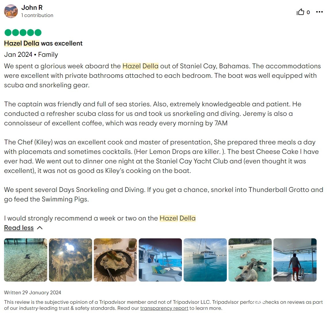 Every day aboard the Hazel Dela was a perfect blend of relaxation and adventure, with the stunning backdrop of the Exumas enhancing every experience. The camaraderie among our group, fostered by Graham’s warm demeanor and Suelet’s culinary delights, created lasting memories that we will cherish forever.