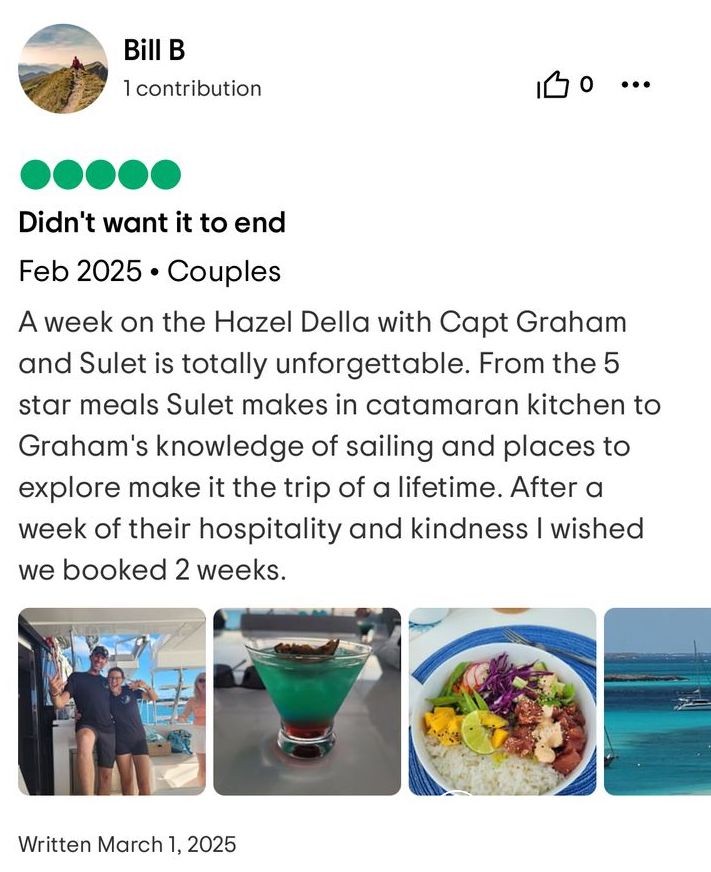 If you’re looking for the ultimate adventure in paradise, do yourself a favor and book a trip with Captain Graham and Chef Suelet on the Hazel Dela. The combination of breathtaking scenery, exhilarating activities, and mouthwatering meals guarantees that the greatest adventure is not just yet to be found; it’s right here waiting for you!