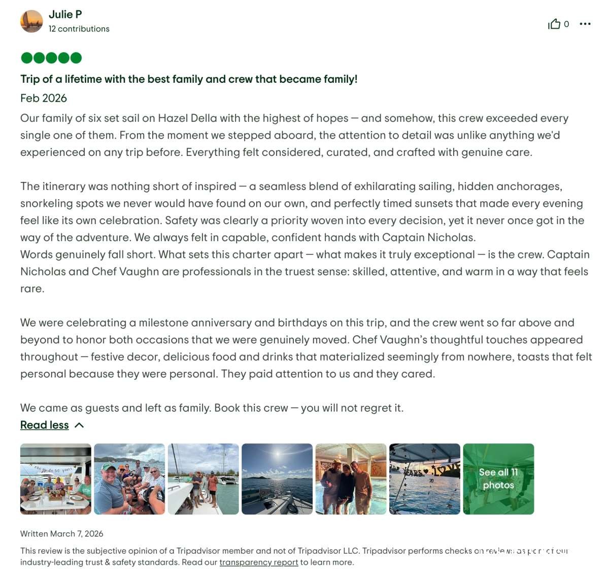 We were enamored by the attention to detail, the kindness, the service of the crew towards their guests. They were always there to serve and even teach the basics of sailing and boat life. When asked, they would share their adventures in previous roles, multiple countries, motorcycle and hiking, overlanding and camping. This previous experience, and the “heart of an adventurer” they possess seems to have prepared them for this current place in life which they excel at. They made us feel like family, and we would certainly accept them into ours!
