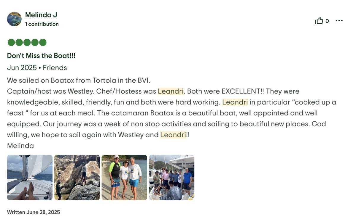 Captain/host was Westley. Chef/Hostess was Leandri. Both were EXCELLENT!! They were knowledgeable, skilled, friendly, fun and both were hard working. Leandri in particular "cooked up a feast " for us at each meal. The catamaran Boatox is a beautiful boat, well appointed and well equipped. Our journey was a week of non stop activities and sailing to beautiful new places. God willing, we hope to sail again with Westley and Leandri!!