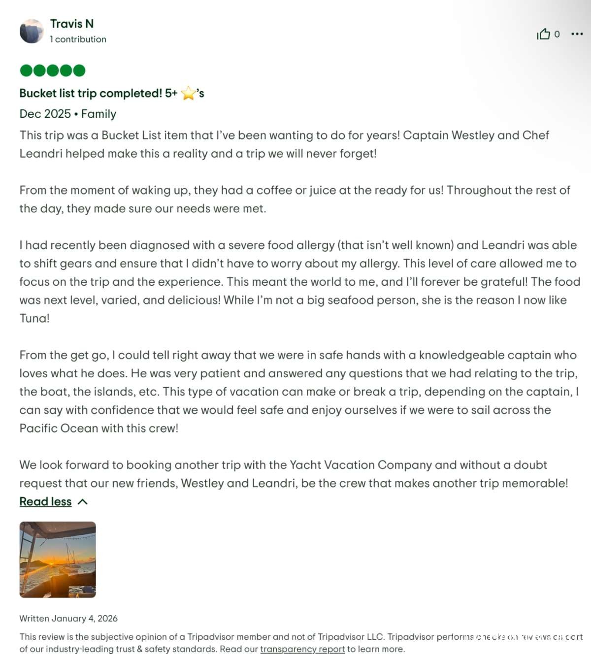 From the get go, I could tell right away that we were in safe hands with a knowledgeable captain who loves what he does. He was very patient and answered any questions that we had relating to the trip, the boat, the islands, etc. This type of vacation can make or break a trip, depending on the captain, I can say with confidence that we would feel safe and enjoy ourselves if we were to sail across the Pacific Ocean with this crew!