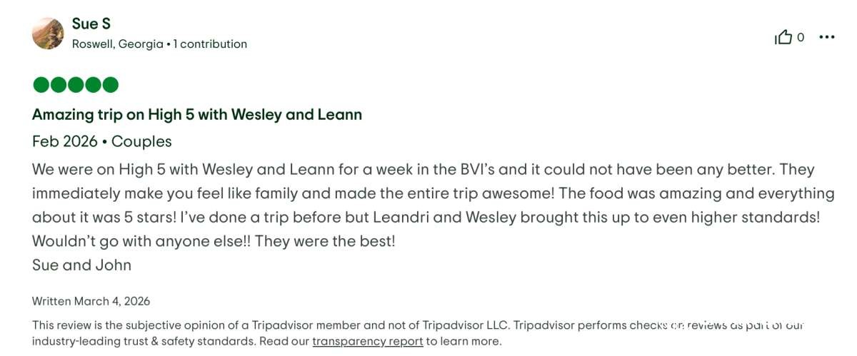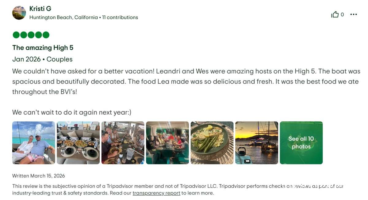 Thank you for such a wonderful trip on High 5. Everything has been first class - the food, the fun, and all the great company. Hot Tamale is the best captain/crew duo in the BVI! We will not forgot you guys.