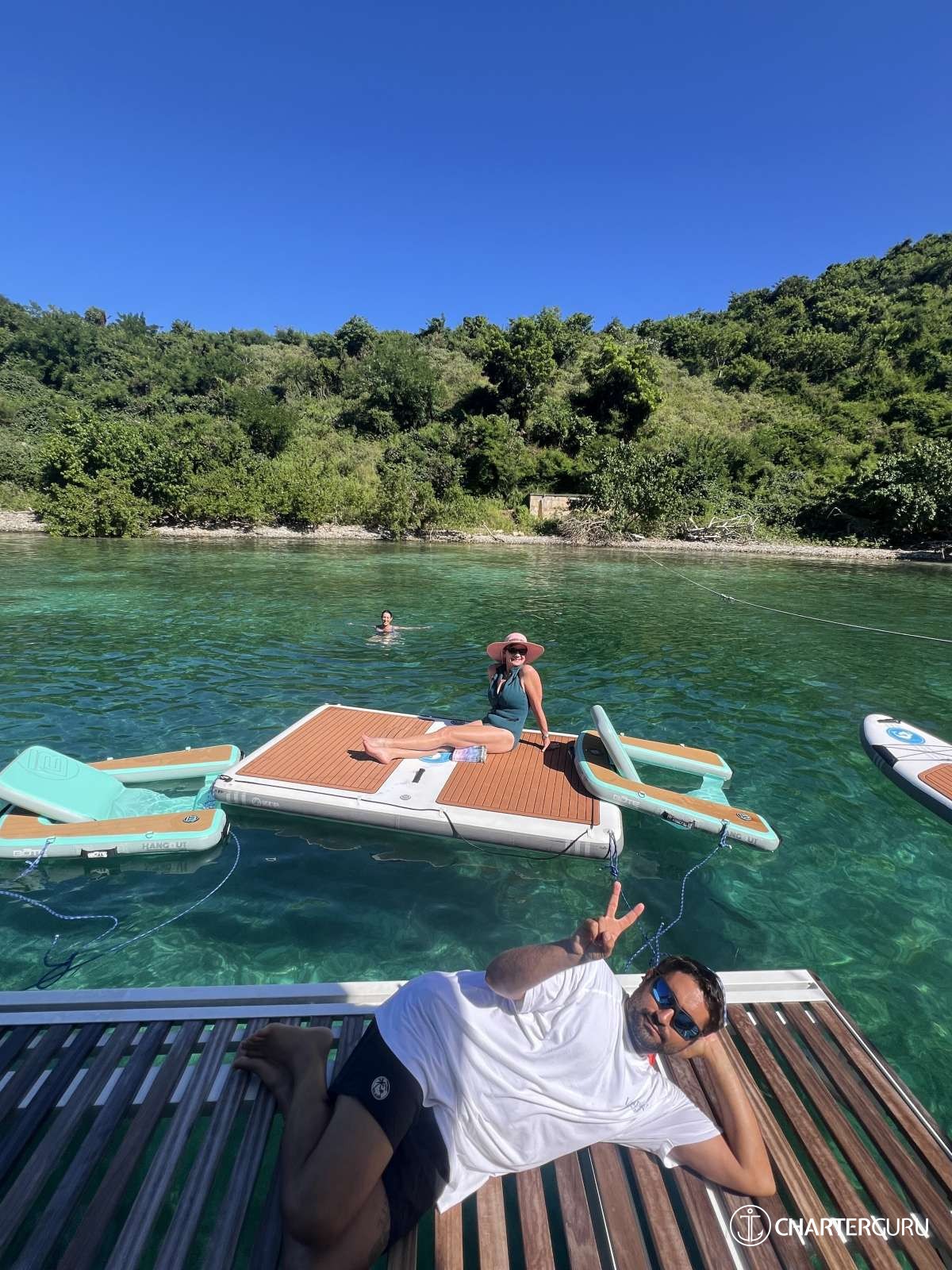 What sets Kemba apart is the way he balances professional command with a sense of vitality and play. As a certified coach and trainer, he opens the door for guests to welcome the day with sunrise breathwork, mindful movement, or quiet meditation on deck—simple practices that can reset body and mind. Adventure is always within reach, whether that means diving a reef, sailing between islands, tubing behind the tender, or joining in a round of beach Olympics on shore. When evening comes, the pace naturally softens: cocktails mixed by Kemba, dishes created by Emily, and conversations that flow easily after a day shaped by salt, sun, and sea.