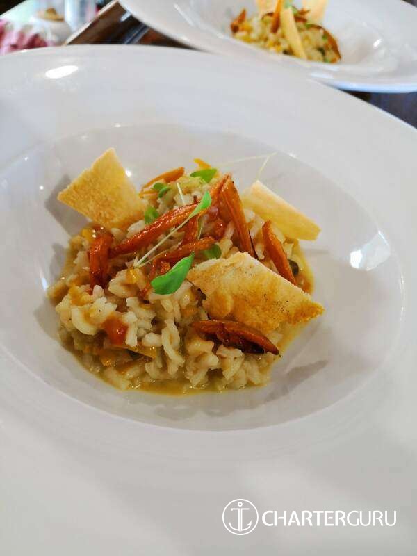 Pumpkin and saffron risotto with bacon chips