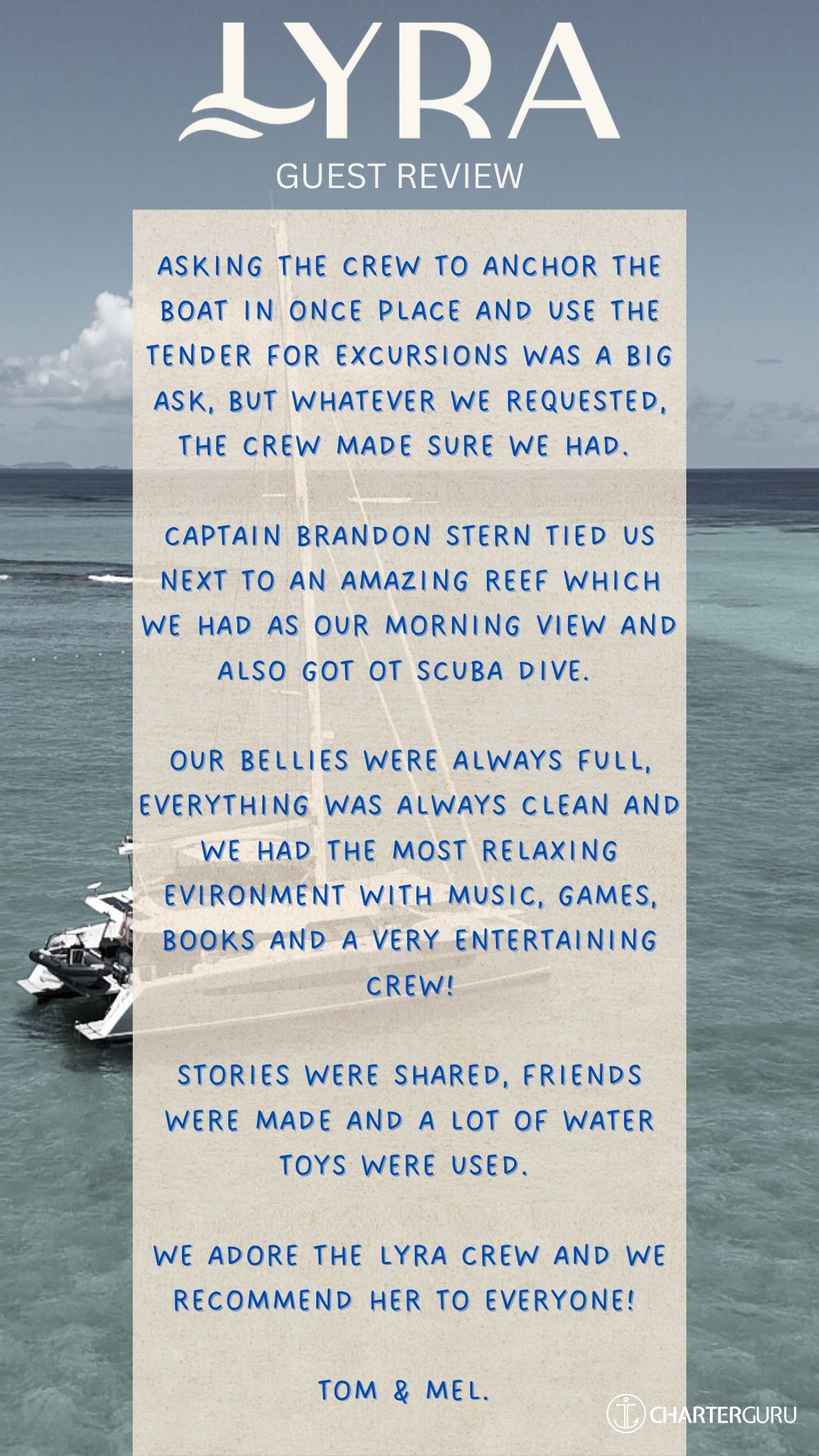 We adore the Lyra crew and we recommend her to everyone!