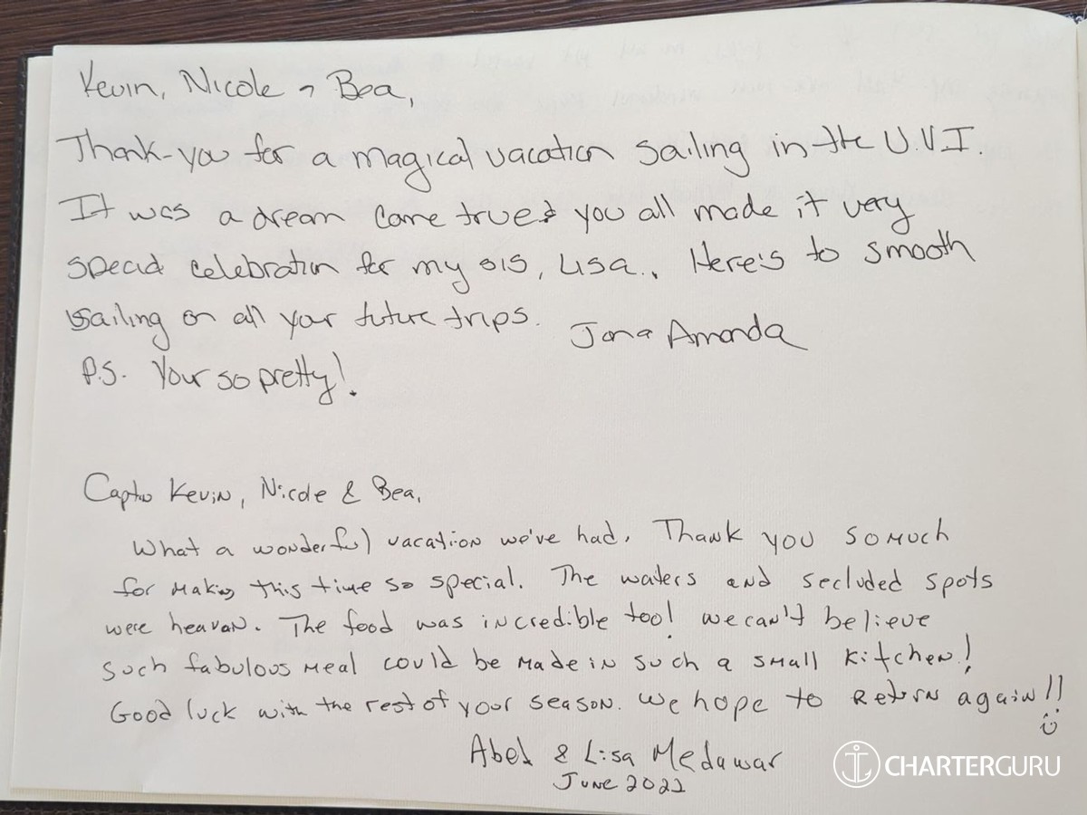 Thank you so much for an amazing trip around the BVI’s. As our first time on a boat trip, this trip highly exceeded our expectations. Your attention to detail and selfless service was over the top. The food was Michelin Star worthy!! We will never forget you guys and this amazing trip! Thank you Kevin, Nicole and Bea. Miss you already!