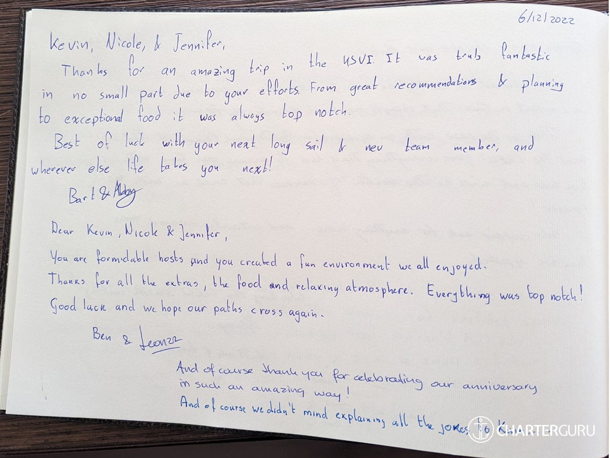 Thanks for an amazing trip to the USVI. It was fantastic in no small part due to your efforts, from great recommendations to planning the exceptional food. It was always top-notch. Best of luck with your next long sail and new team member, and wherever life takes you both.