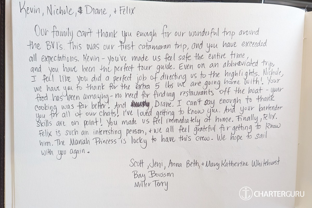 Thank you so much for such an unforgettable experience! Our first time in the BVI will be hard to beat. Thank you for the amazing food, laughs, memories, and smiles. We wish y’all the best on the many adventures to come! Ginger