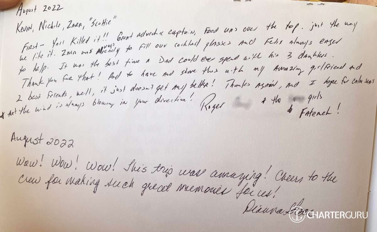 First-all killed it!! Great adventure Captain, food was over the top, just the way we like it. Zara was always ready to fill out cocktail glasses and Felix always eager to help. It was the best time a day could ever spend with his 3 daughters. Thank you for that! And to have and share this with my amazing girlfriend and two best friends, well, it just doesn’t get any better! Thanks again, and I hope for calm seas and the wind is always blowing in your direction. Roger and the Girls