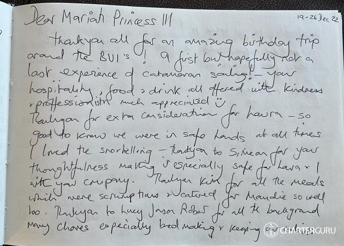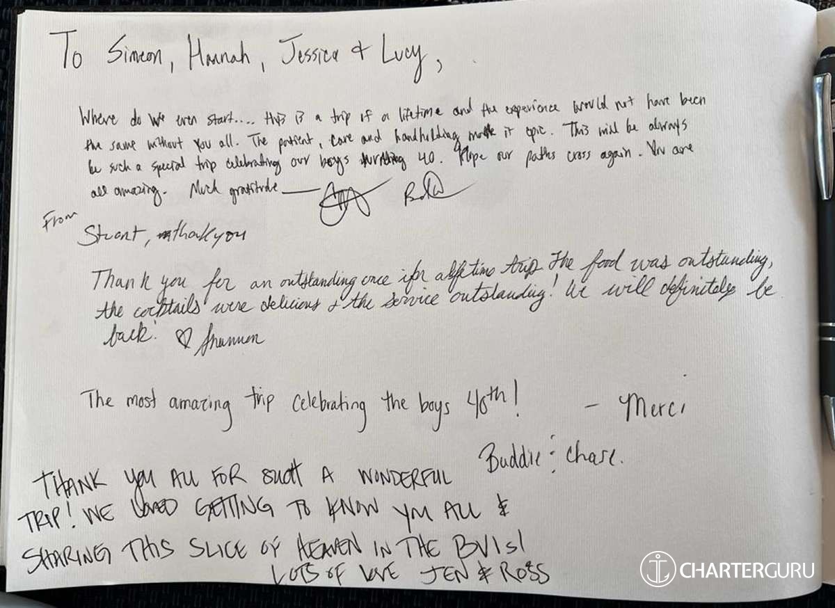 Thank you all for an amazing birthday trip around the BVI’s! A first but hopefully not a last experience of catamaran sailing! Your hospitality, food and drink all offered with kindness and professionalism much appreciated