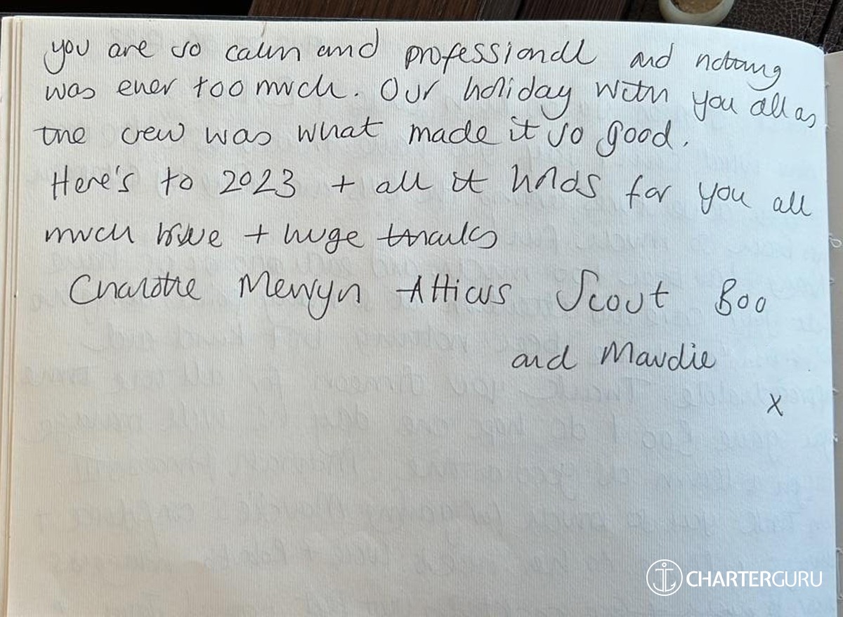 You are so calm and professional and nothing was ever too much. Our holiday with you all as the crew was what made it so good. Here’s to 2023 and all it holds for you all. Much hugs and huge thanks, Charlotte, Aerwyn, Atticus, Scout, boo and Maudie