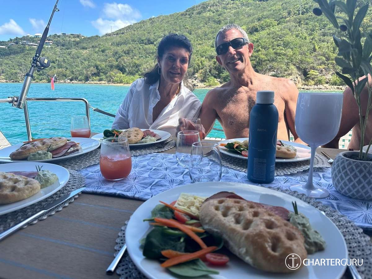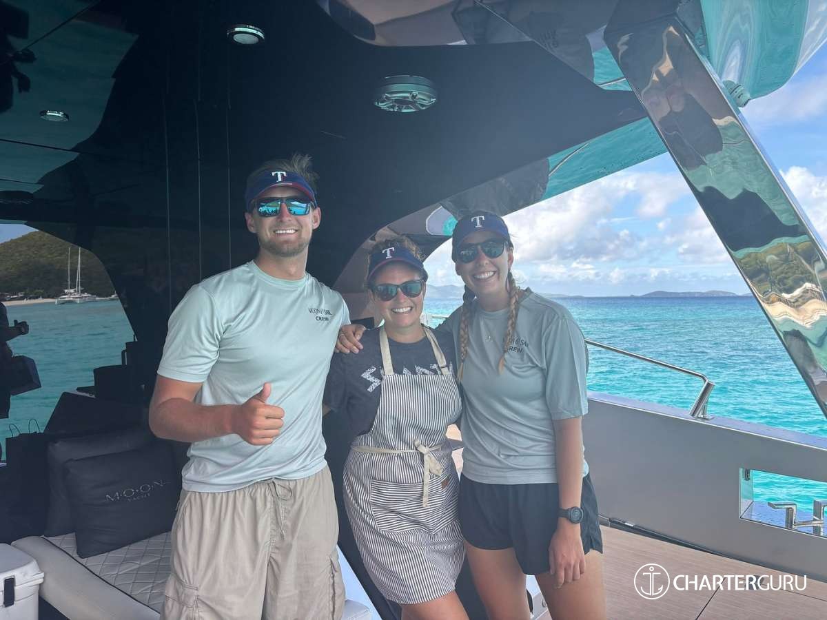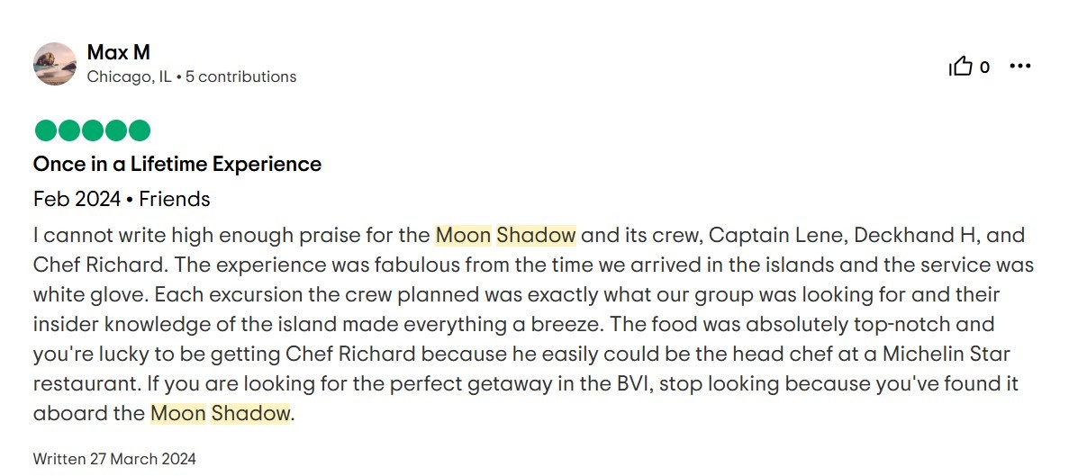 I cannot write high enough praise for the Moon Shadow and its crew, Captain Lene, Deckhand H, and Chef Richard. The experience was fabulous from the time we arrived in the islands and the service was white glove. Each excursion the crew planned was exactly what our group was looking for and their insider knowledge of the island made everything a breeze. The food was absolutely top-notch and you're lucky to be getting Chef Richard because he easily could be the head chef at a Michelin Star restaurant. If you are looking for the perfect getaway in the BVI, stop looking because you've found it aboard the Moon Shadow.