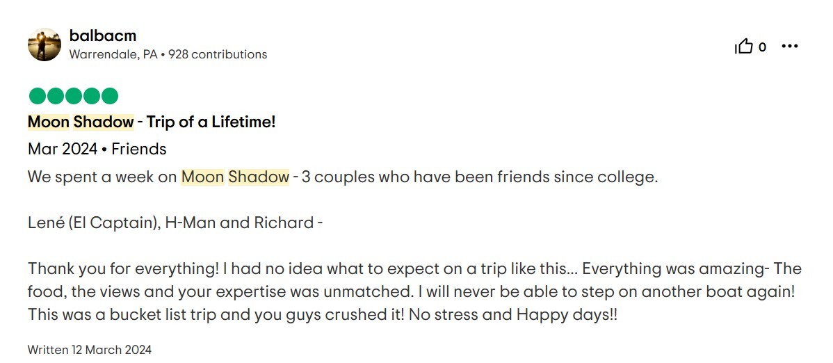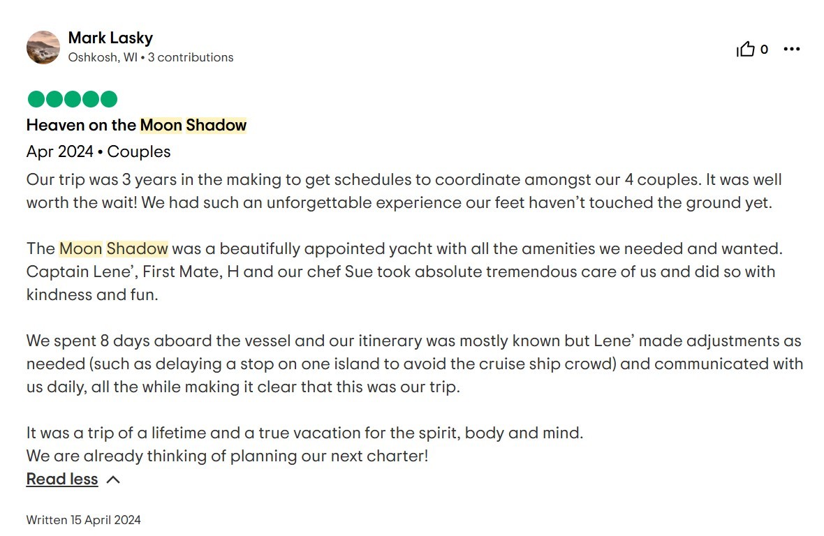For our family of 9, including 7 adult “children,” Moon Shadow was the best vacation we’ve ever enjoyed! The water activities offered hours of laughter and competition! The crew (thanks to Captain Lene and Deck Hand H) were not only capable, but endlessly accommodating! Our food (thank you, Chef Richard) was both beautiful and delicious, every meal topped the one before!! The boat was immaculate, stunning and spacious! The views were breathtaking, both on the boat and during shore excursions. The shore excursions were tailored to our desires…shopping, beach football, searching for the perfect island cocktail. The name “Moon Shadow” will forever bring a smile to our faces!! HIGHLY RECOMMEND, with no reservations!!