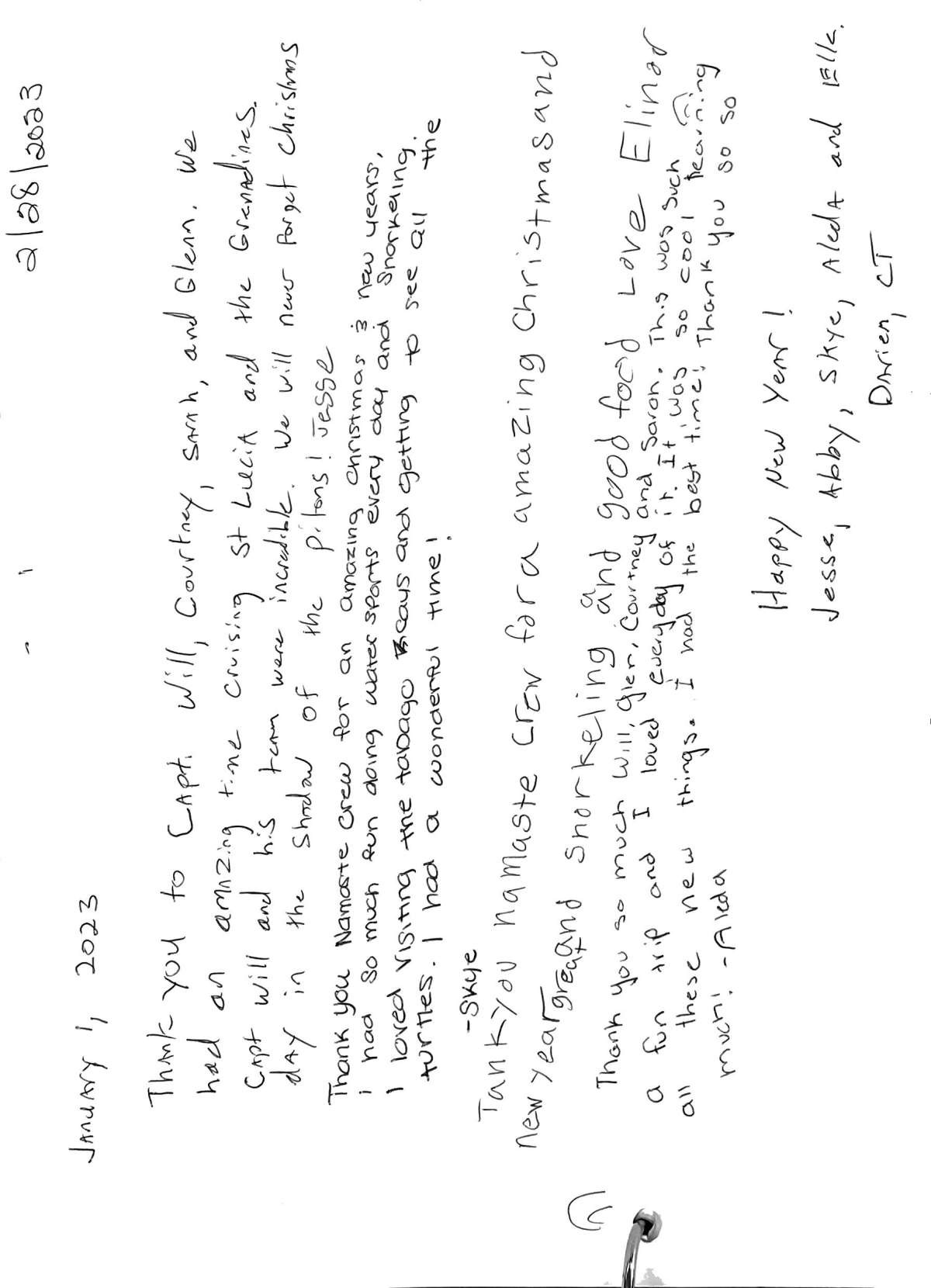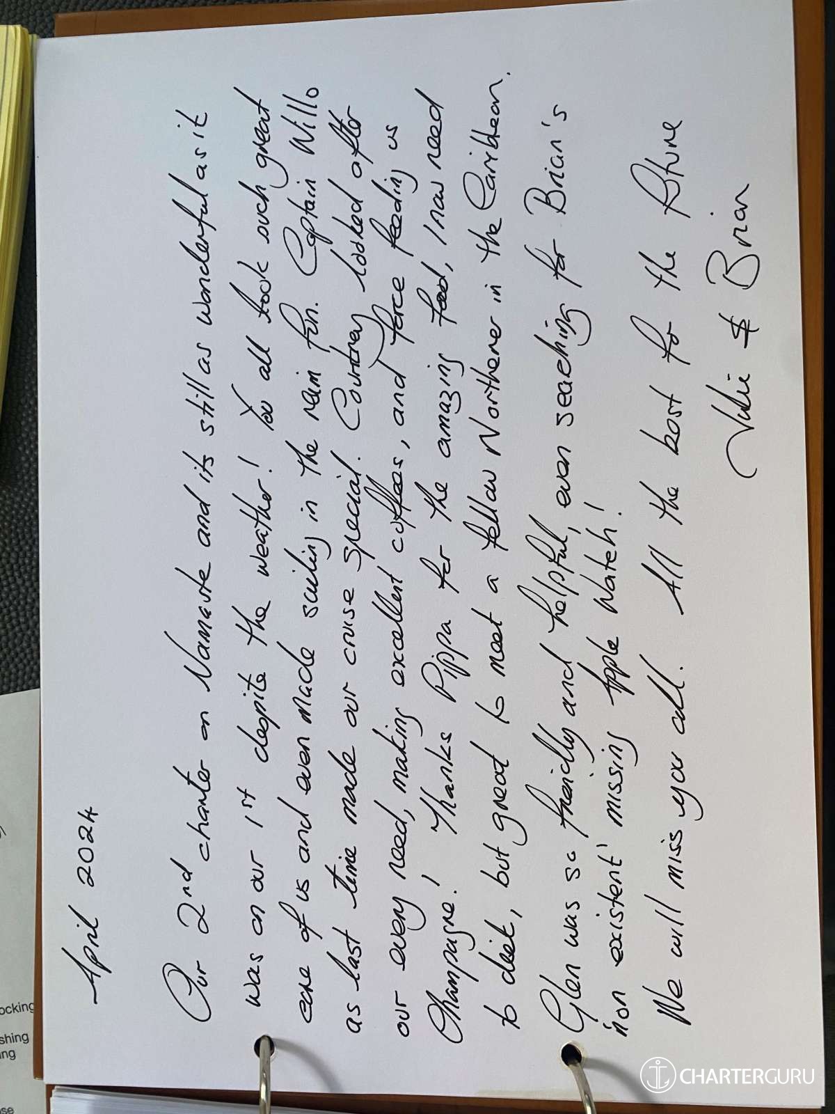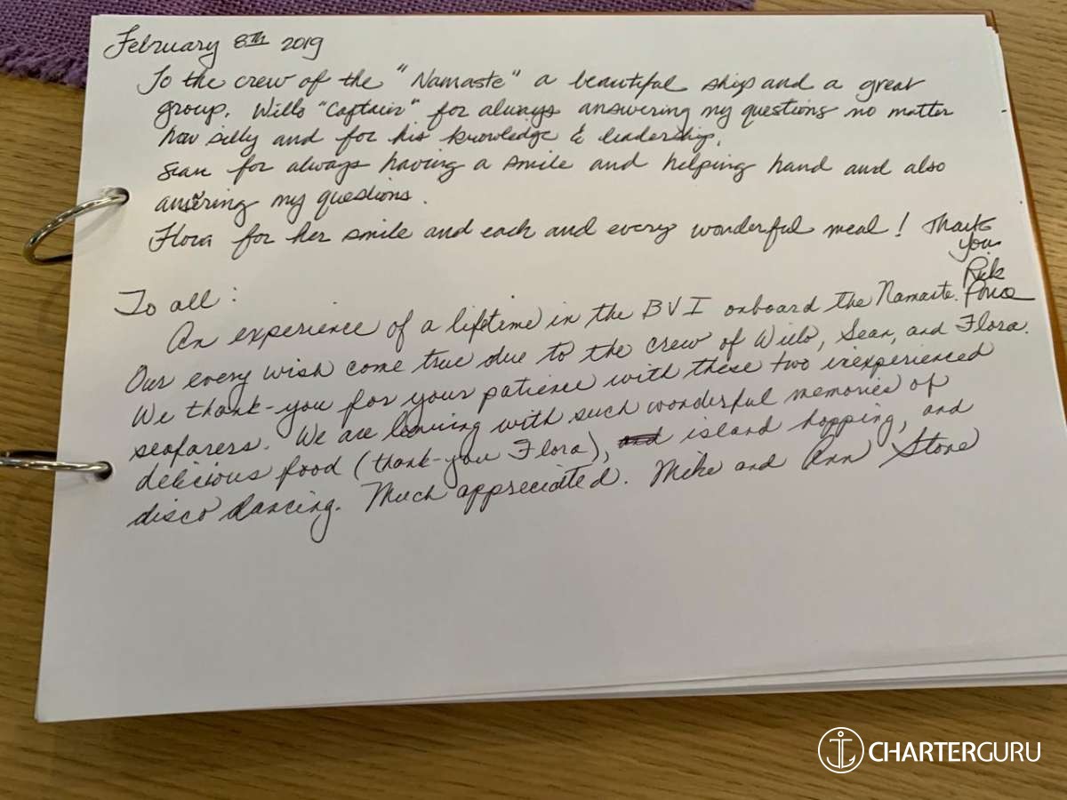 To all: an experience of a lifetime in the BVI's onboard the NAMASTE. Our every wish come true due to the crew of Willo, Sean and Flora. We tank you for your patience with there two inexperienced explorers.We are leaving with such wonderful memories of delicious foo (thank you Flora) and disco dancing. Much appreciated.