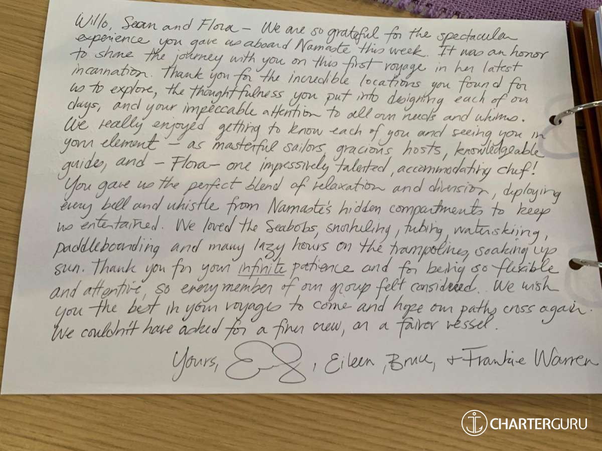 Namaste was the perfect catamaran for us - the crew went above and beyond to take care of our every need.