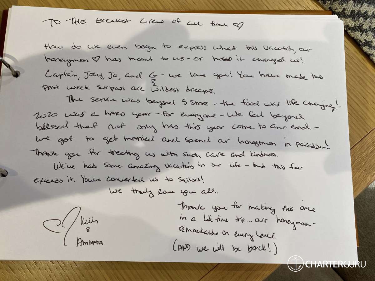 The yacht was the ideal size and that he was incredibly impressed with Cpt. Will and how he was so communicative and that Courtney was so great with their girls and the cocktails and that the food was delicious!