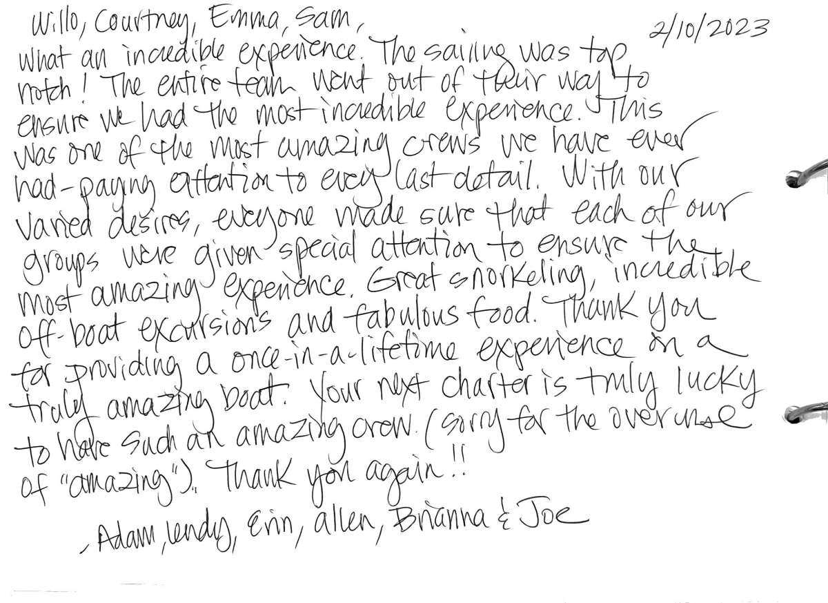 We are so grateful for the spectacular experience you gave us aboard this week. It was an honor to share the journey with you on this first voyage in her latest incarnation. Thank you for the incredible locations you found for us to explore, the thought fulness you put into disgining each of our days, and your impecable attention to all our needs.