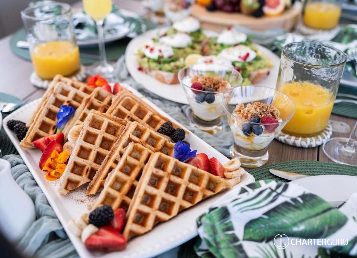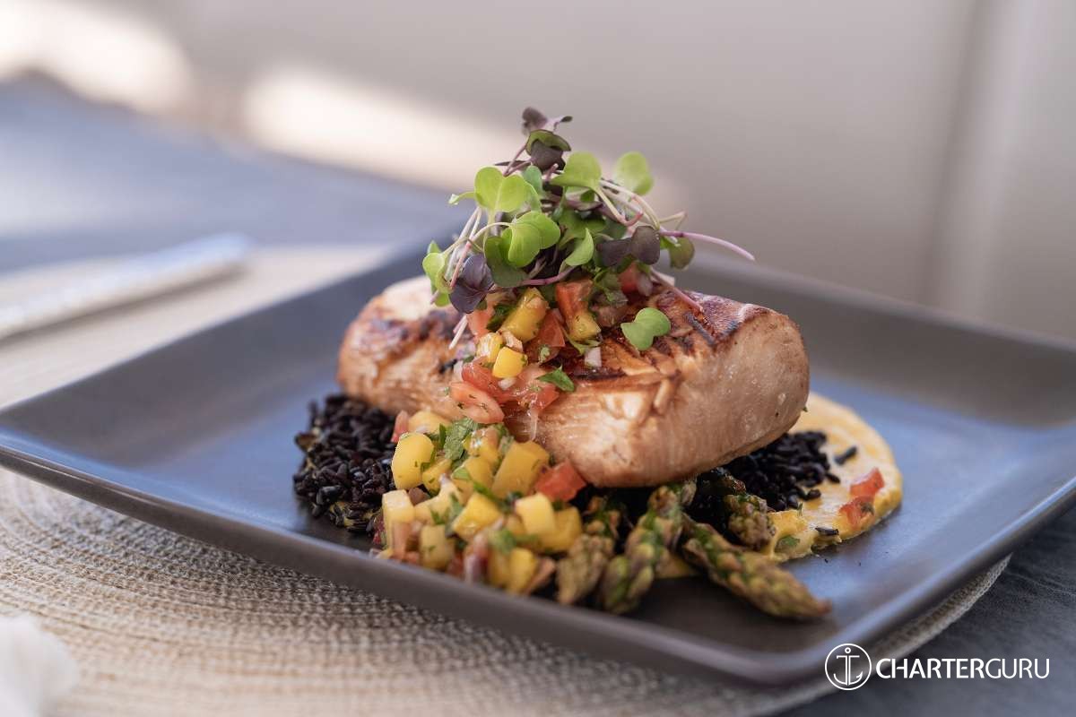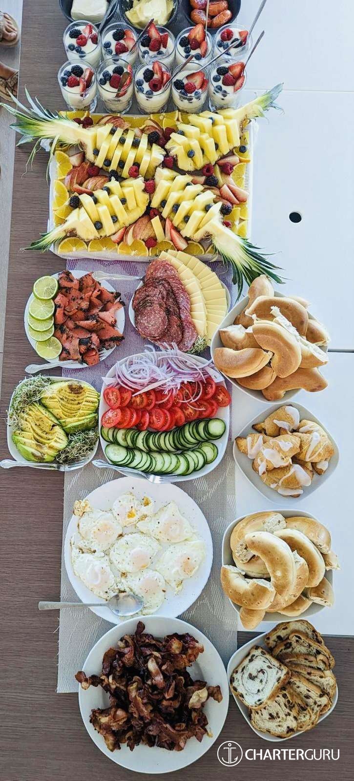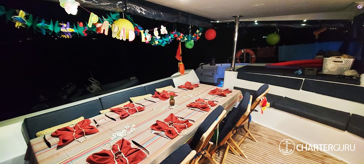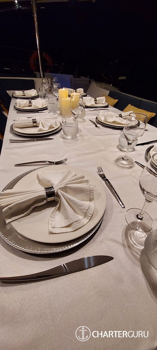 NENNE is presented primarily as a sailing catamaran. The the heart of the yacht is the main saloon, which connects to the aft deck. The aft deck features a variety of seating areas and that's where most of the meals are served. The tasteful cabins are located in the 2 massive hulls. The cabins offer unbeatable views in the morning and are located just below deck. Multiple portholes offer desirable views, while providing privacy if needed.