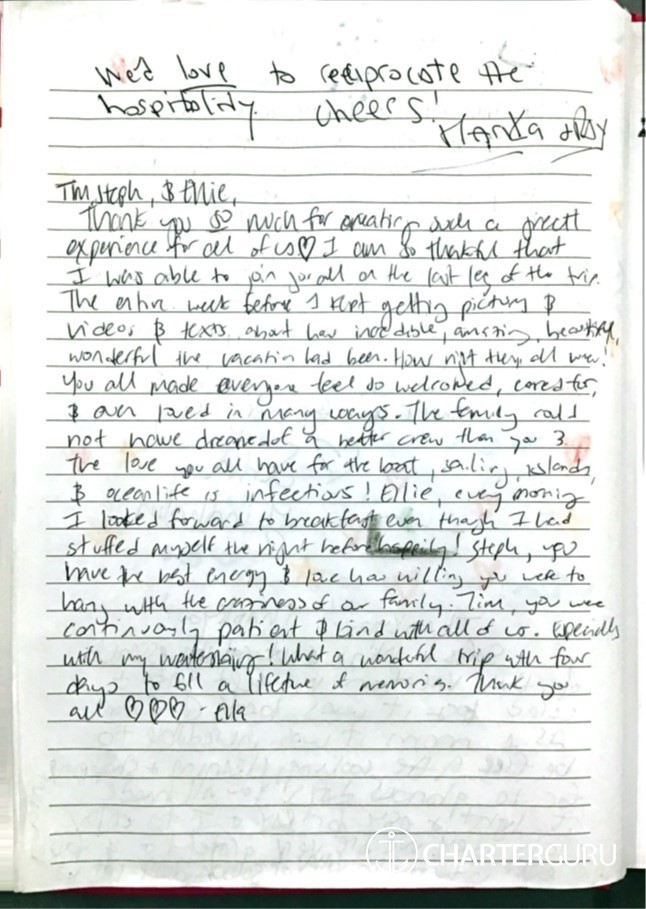 “Thank you for the wonderful experience of a lifetime that we will never forget. We hope to do it again in the next few months or years. Happy sailing and we will be in touch through out the year. Take care and safe travels.