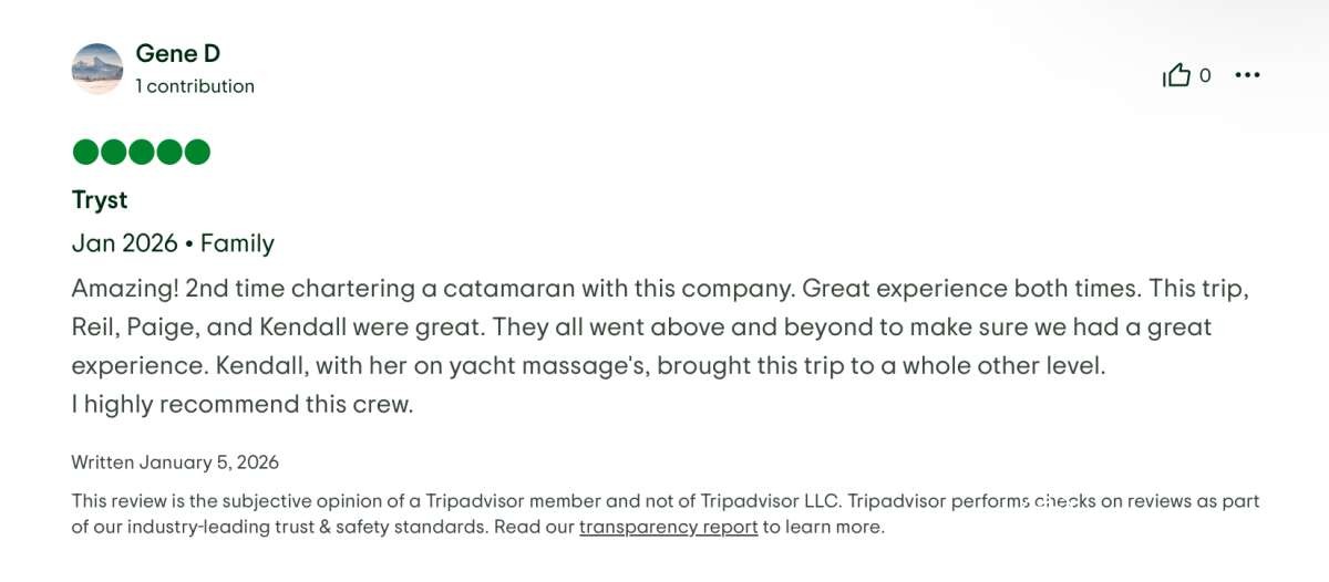 CJ the captain alwyas made us feel completely safe and relaxed while navigating and meeting every need. Mate McKensie was always one step ahead, anticipating our needs and ensuring every detail was handled flawlessly. And Chef Tilly.. was superb!!! Every meal was beautifully prepared, delicious, and felt like a personalized culinary experience on the water. Tilly even went out of her way to accommodate my non eating seafood requests. I know.. a week at sea and no seafood!! lol but Tilly always had something spectacular for me to enjoy along with everyone else.