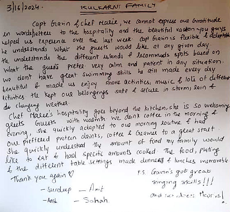 Thank you so much for an unforgettable vacation! The food, stories and company was beyond amazing. The yacht is gorgeous and I thank you for allowing me to spend time with my family which is rare these days when we are always on the go.