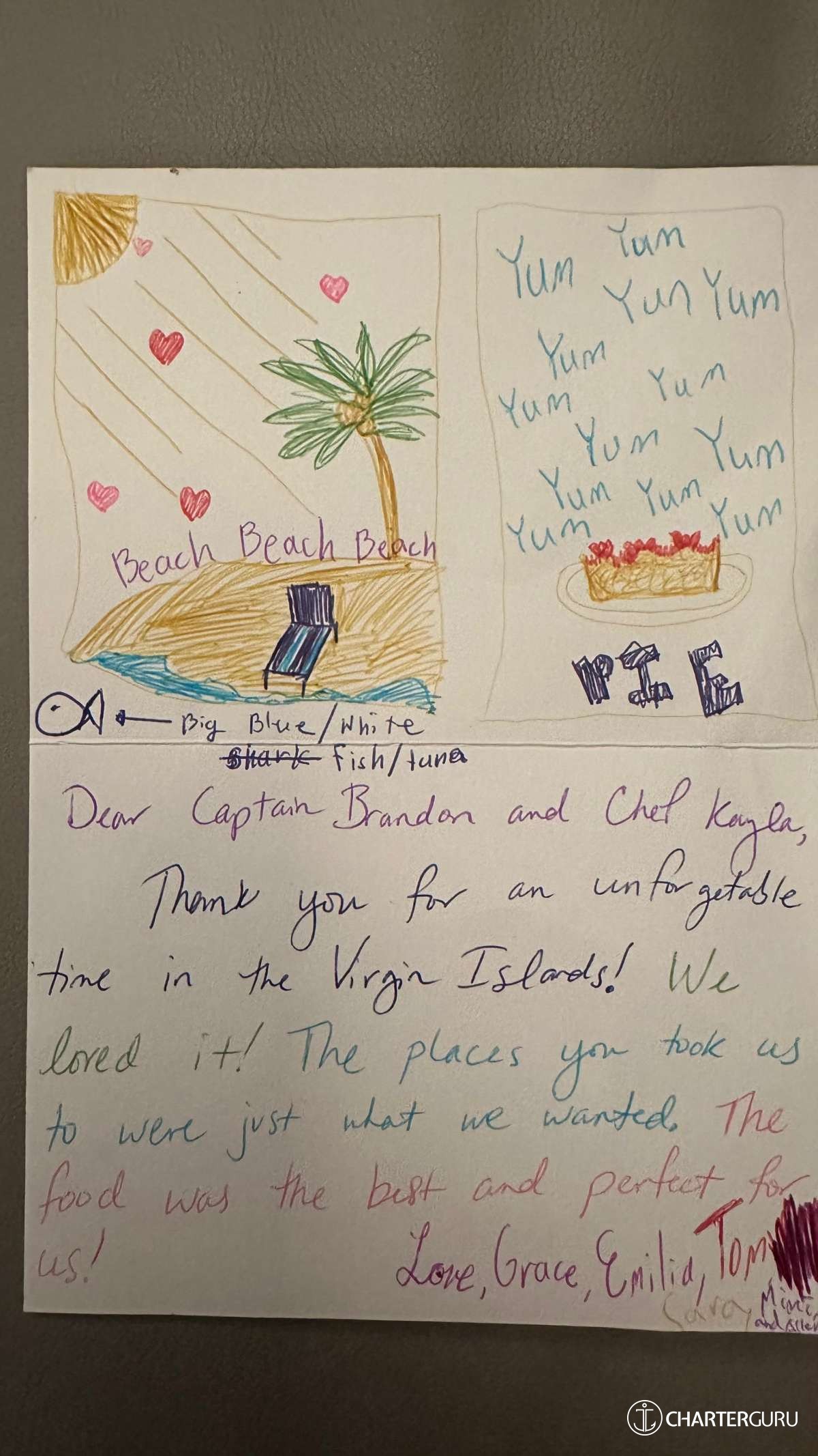 From the moment our family stepped on the vessel, Captain Brandon & Chef Aiesha made us feel at home. They were attentive to our needs and wants for meals, activities and ensuring our trip was full of lasting memories. The catamaran was clean, spacious from the point that there were many areas to enjoy the surrounding views and keep sight of my kids in the water, rays of sunshine, quiet spot for a good book and quiet and cool at night for a good rest.