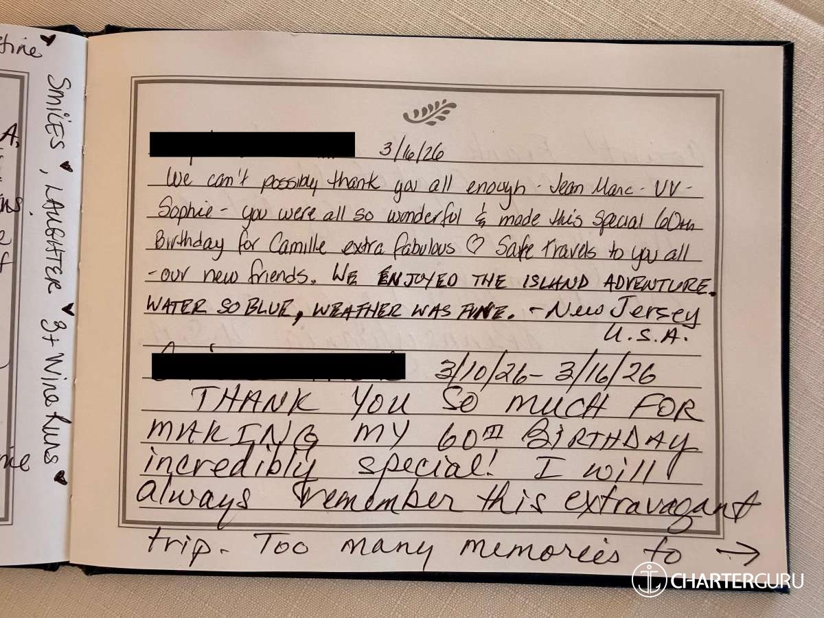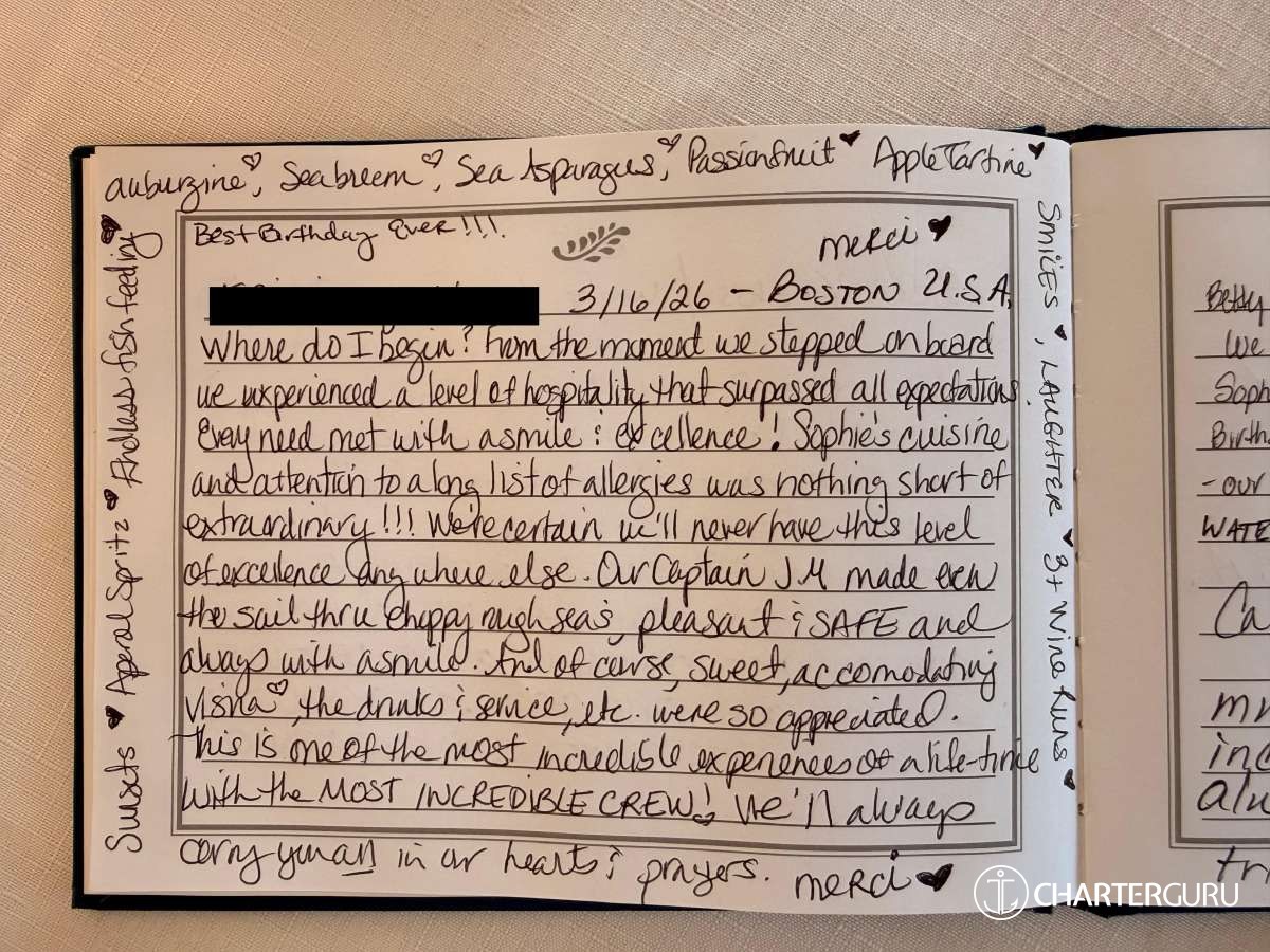 Where do I begin? From the moment we stepped onboard we experienced a level of hospitality that surpassed all expectations. Every need met with a smile & excellence! Sophie’s cuisine and attention to a long list of allergies was nothing short of extraordinary!!! We’re certain we’ll never have this level of excellence anywhere else. Our Captain J.M. made even the sail thru choppy seas pleasant & SAFE and always with a smile. Full of course, sweet, accommodating Veasna ❤️, the drinks & service, etc. were so appreciated. This is one of the most incredible experiences of a life-time with the MOST INCREDIBLE CREW! We’ll always carry you in our hearts & prayers. Merci ❤️