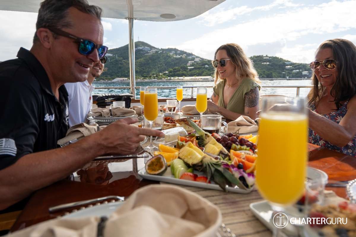 This opulent yacht ensures an unforgettable experience, accommodating up to 6 guests in three spacious queen cabins. For larger groups or multi-generational vacations, the addition of a fourth guest cabin featuring two singles and two fold-down single bunks provides the perfect setup. Whether you're seeking a serene escape with family or planning an intimate gathering with friends, "Steeling Time" caters to both, making it an ideal choice for a group of 8 adults with a couple of singles sprinkled in the mix.